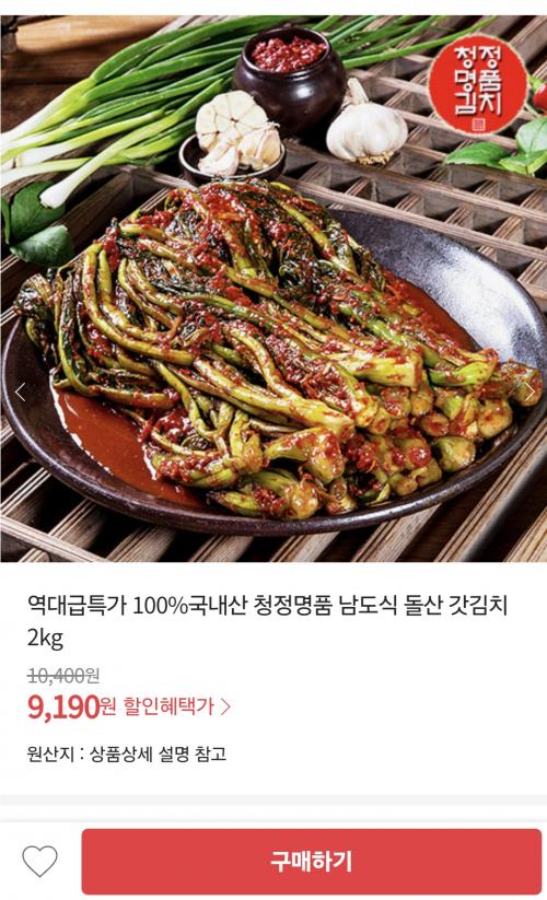 [위메프] 청정명품 국내산100% 돌산 갓김치 2kg (9,190원/무료) > 국내핫딜