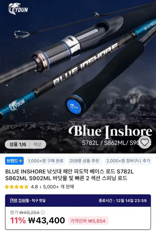 [알리] BLUE INSHORE 해안 파도막 스피닝 낚싯대 (38,765원 / 무료) > 국내핫딜