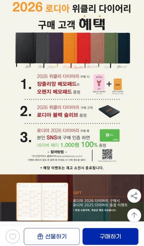 [지마켓] 무료각인 로디아 2026 다이어리 A5 (가로형) (19,310원)