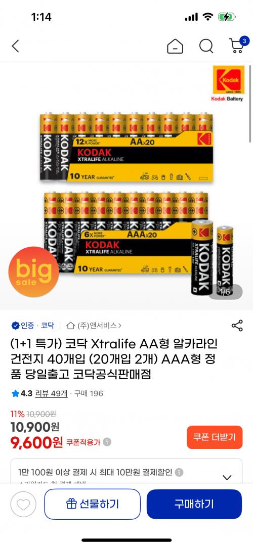 [지마켓] 코닥 AA / AAA형 알카라인 건전지 40개입 (20개입 X 2개) (9,600원/무료) > 국내핫딜