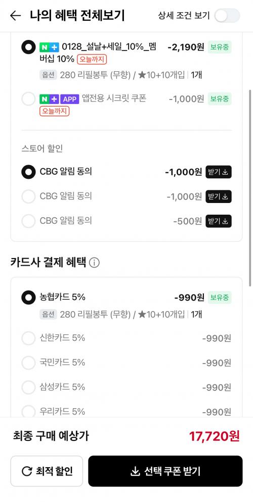 소식알림쿠폰 + 멤버십 설날쿠폰 적용하고 신한카드로 결제하면
