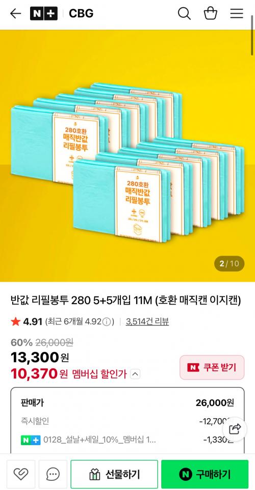 네이버) 매직캔,이지캔 호환리필봉투 280 20개 (17,720원/무배)