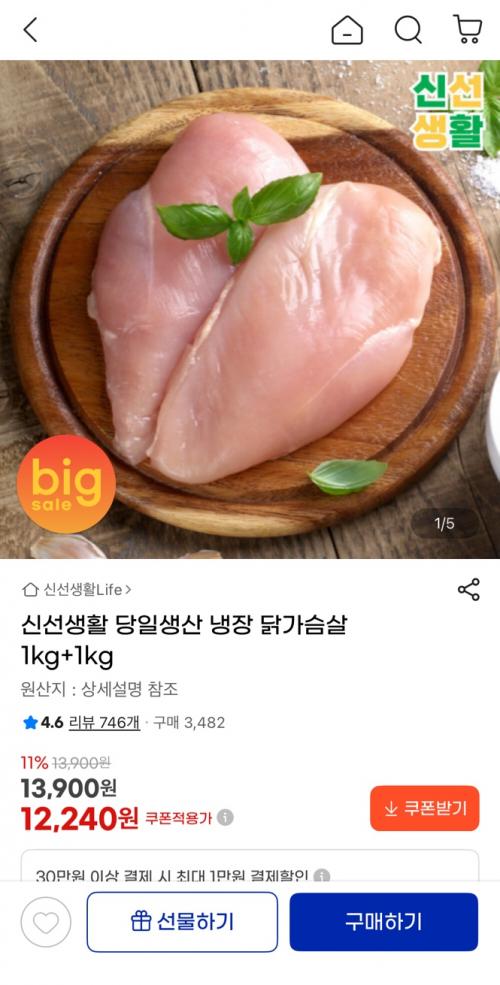[지마켓] 당일생산 냉장 닭가슴살 1kg+1kg (12,240원/무배) > 국내핫딜