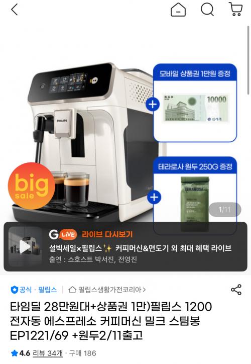 기본 커피머신에 테라로사 원두 250g + 신세계 모바일 상품권 1만원 증정 있어서 체감가는 더욱 내려갑니다.