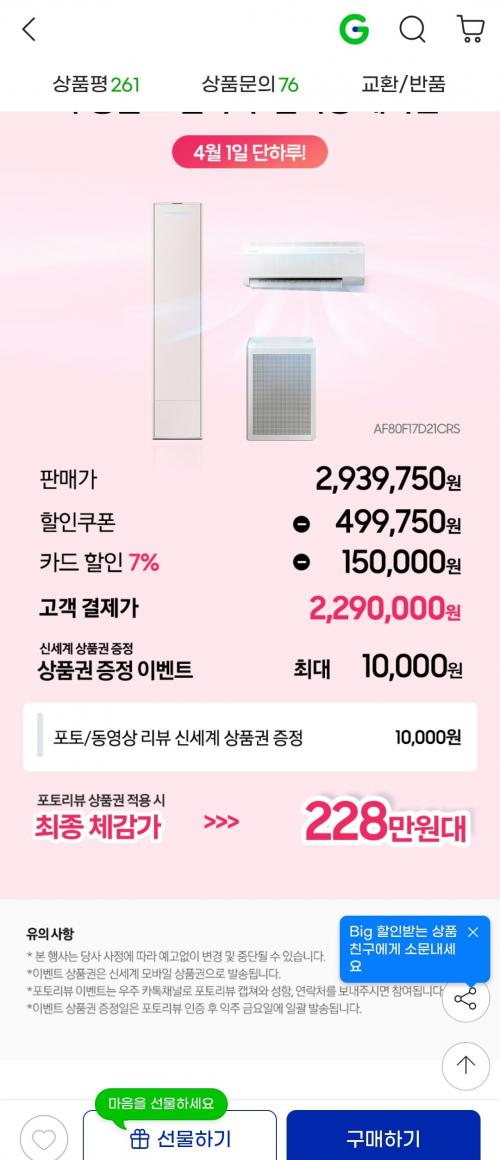 쿠폰+카드 결제 시 229만원 나오고