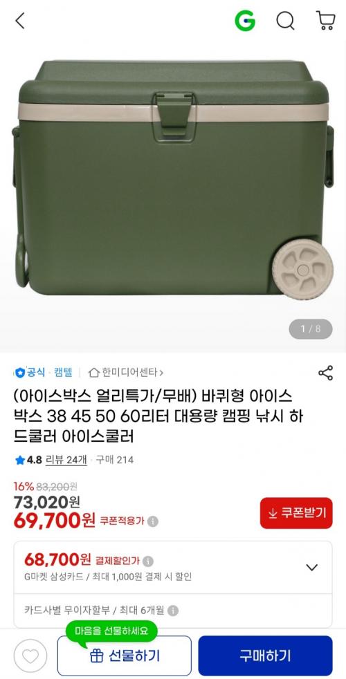 [지마켓] 바퀴형 아이스박스 38 45 50 60리터 대용량 (69,700원 / 무료배송) > 국내핫딜