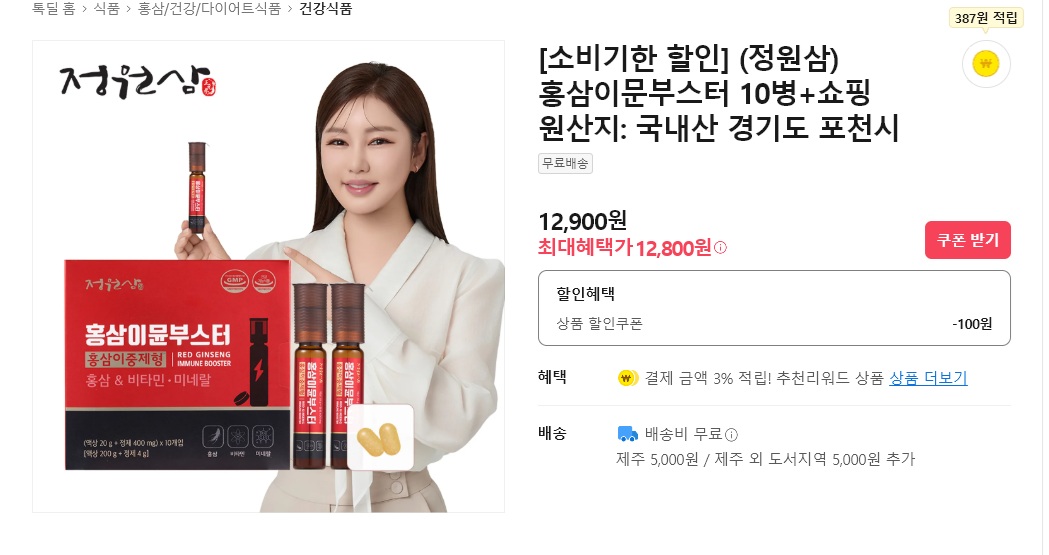[카카오톡딜] (소비기한 할인) 정원삼 홍삼이문부스터 10병+쇼핑백 선물용 (12,900원/무료배송)