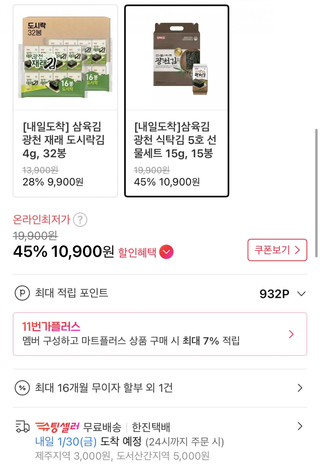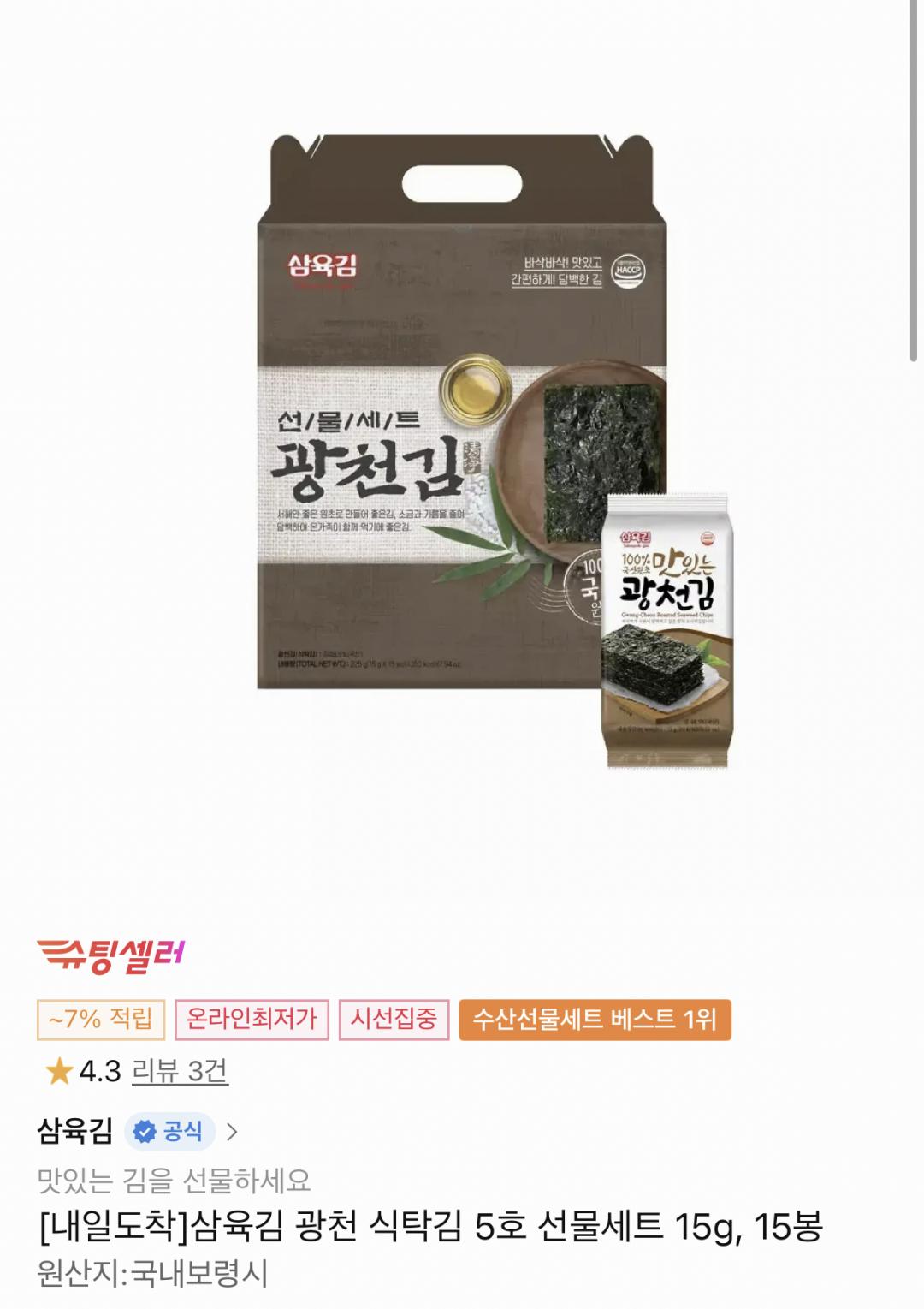 [11번가] 삼육김 광천 식탁김 5호 선물세트 15g, 15봉 (10,900원/무료)