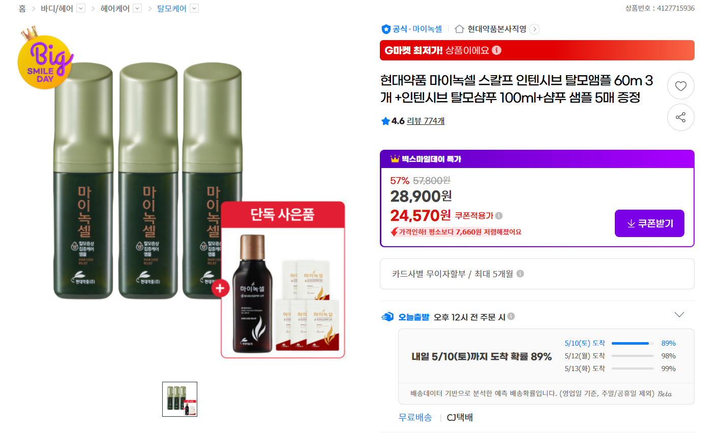 [G마켓] 마이녹셀 탈모앰플 60ml 3개 + 탈모샴푸 100ml + 샘플 5매 (24,570원 / 무료) > 국내핫딜