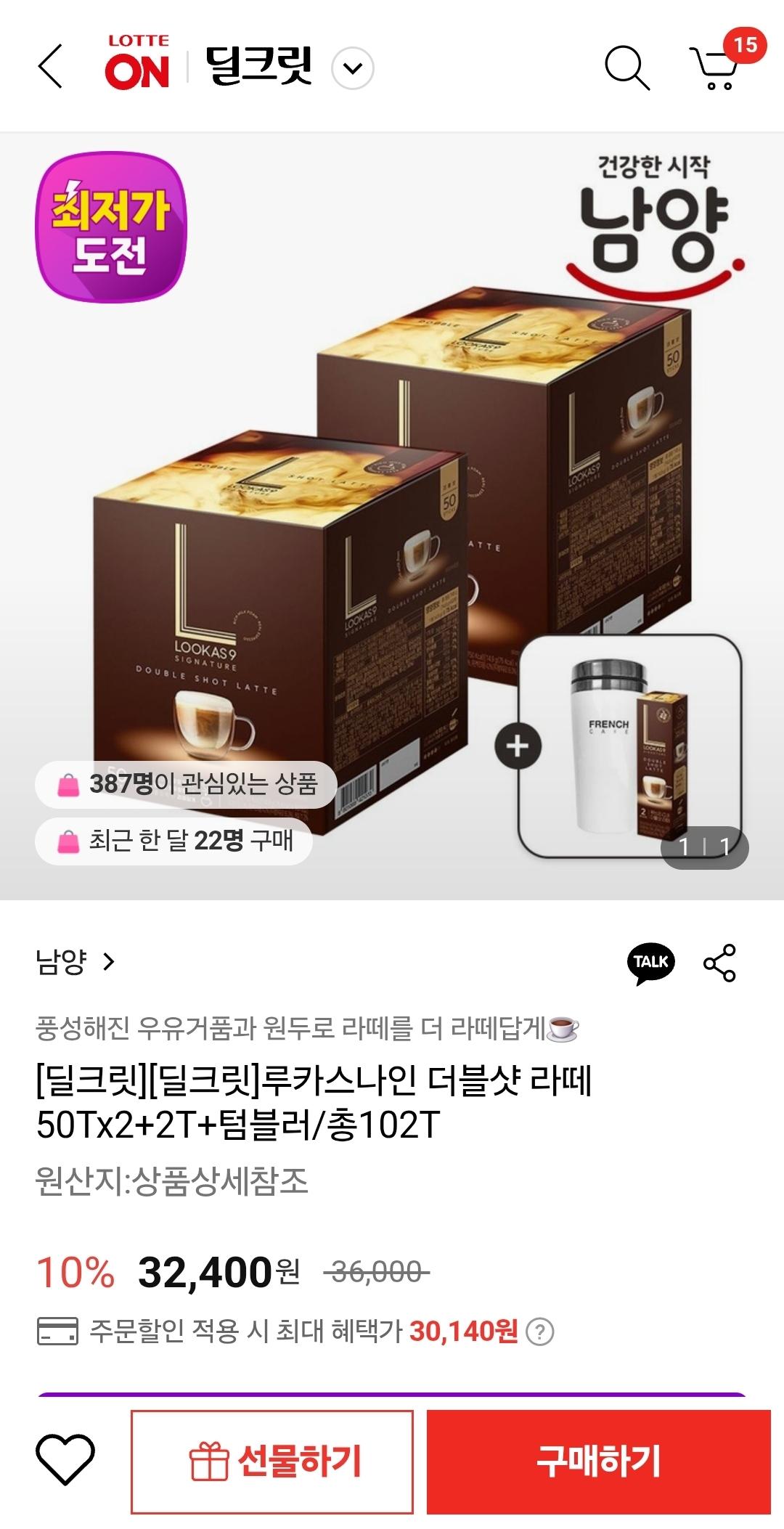 [롯데온] 루카스나인 더블샷 라떼 50Tx2+2T+텀블러 (총102T) (30,140원/무료) > 국내핫딜