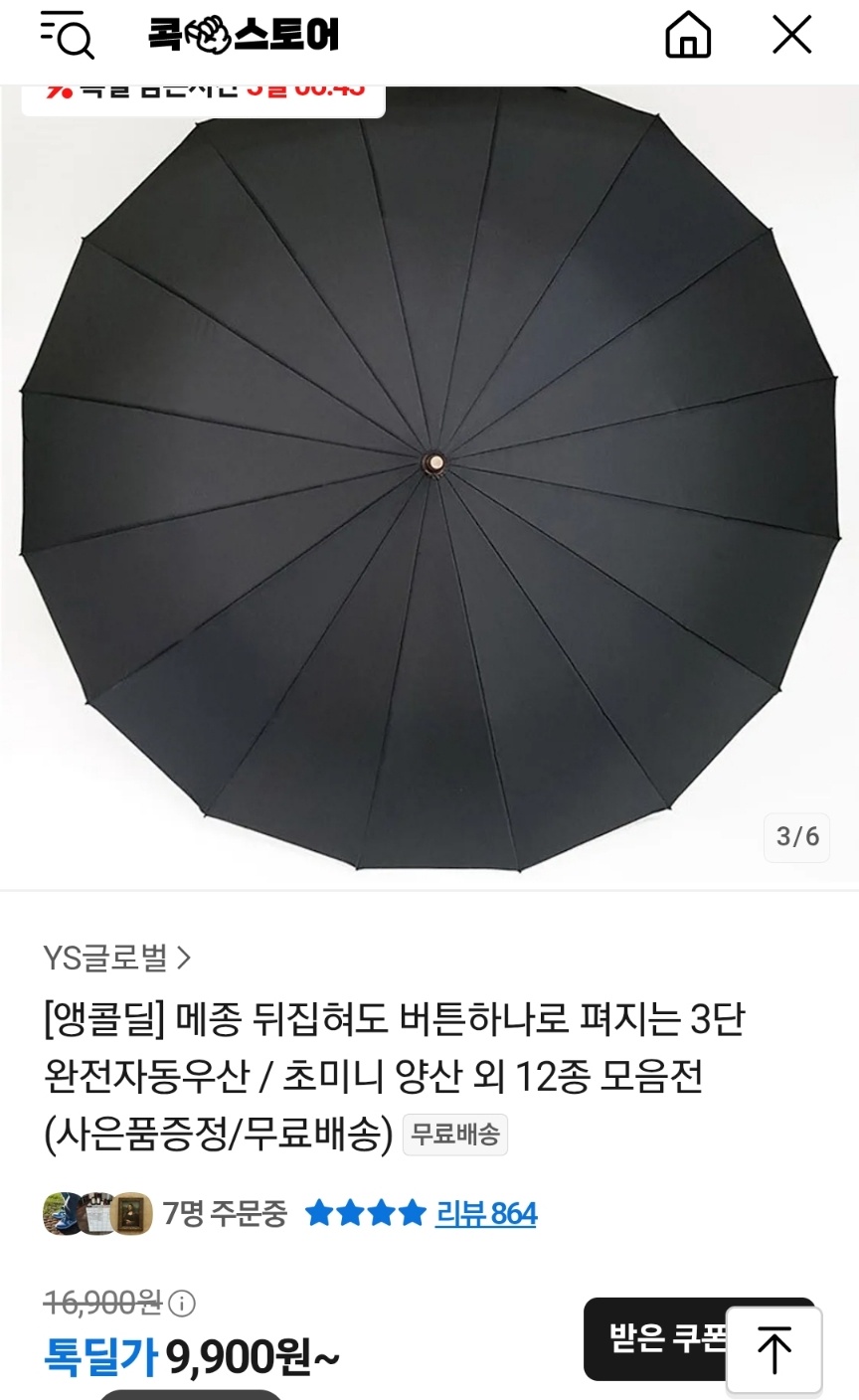 [카카오] 메종 특대형 장우산/ 촘촘살대/ 3단 완전자동우산 외 (9900원/무료)