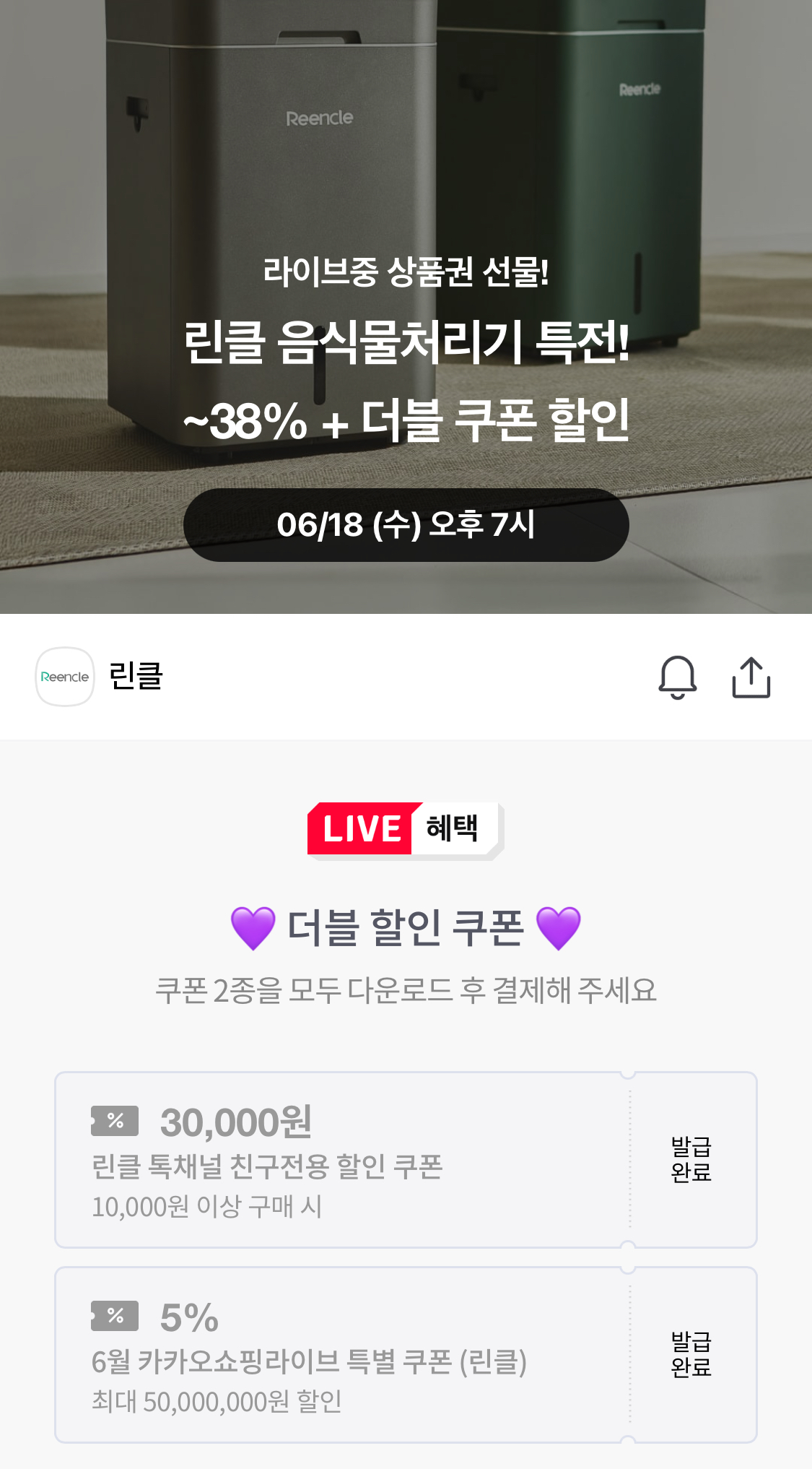 금일 오후 7시부터 진행되는 린클 그래비티W 음식물처리기 라이브 방송에서