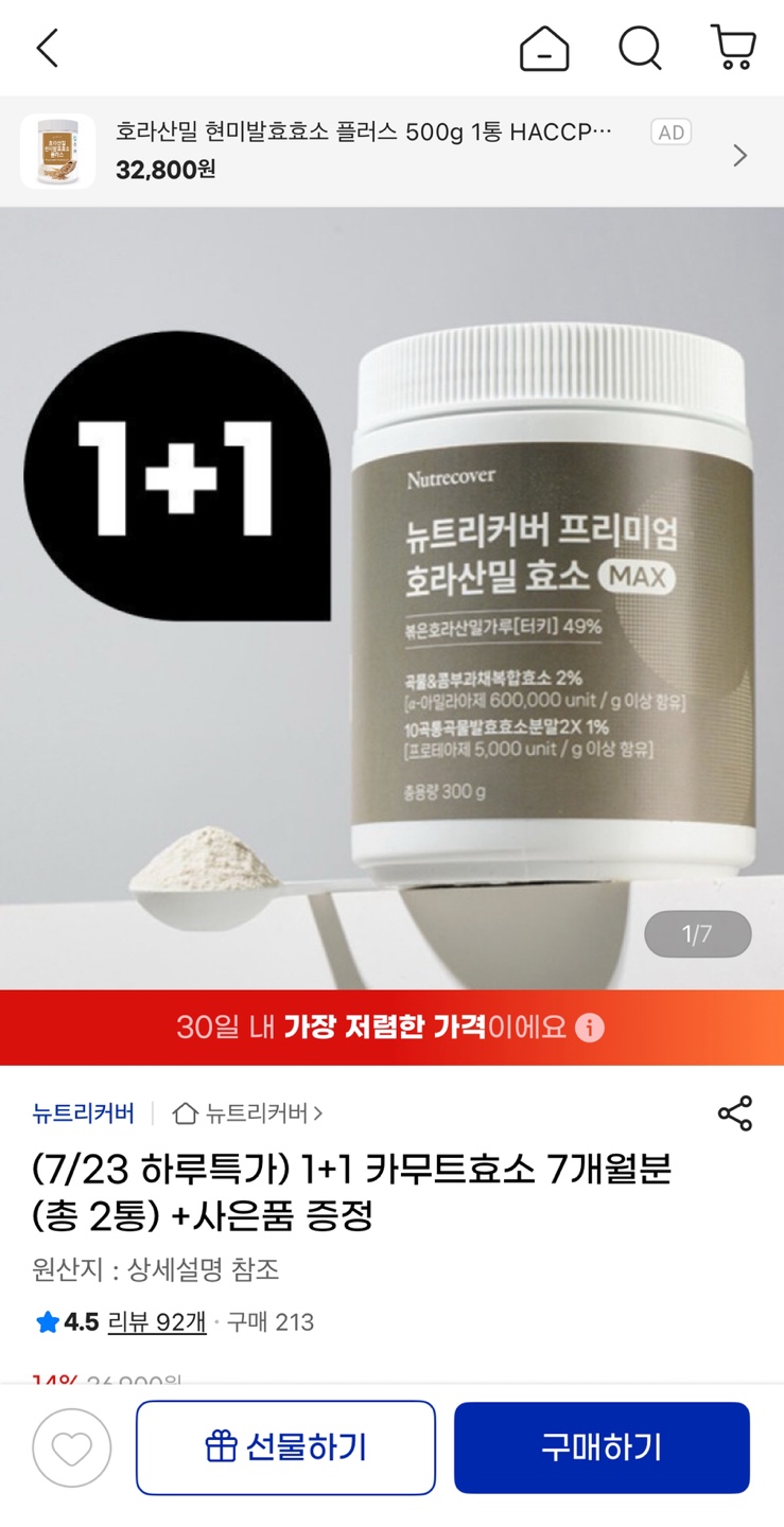 [지마켓] 카무트효소 1+1 7개월분 사은품 증정 (33,300원/무료) > 국내핫딜