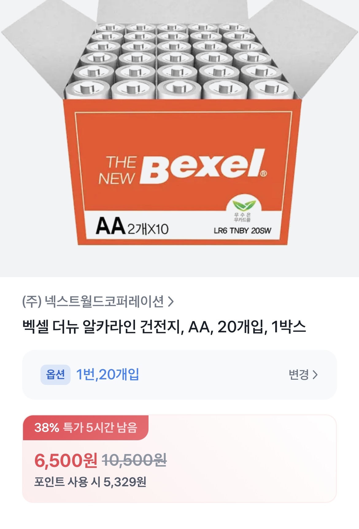 [토스] 초핫딜!! 벡셀 알카라인 AA건전지 20개입 (6,500원/무배) > 국내핫딜