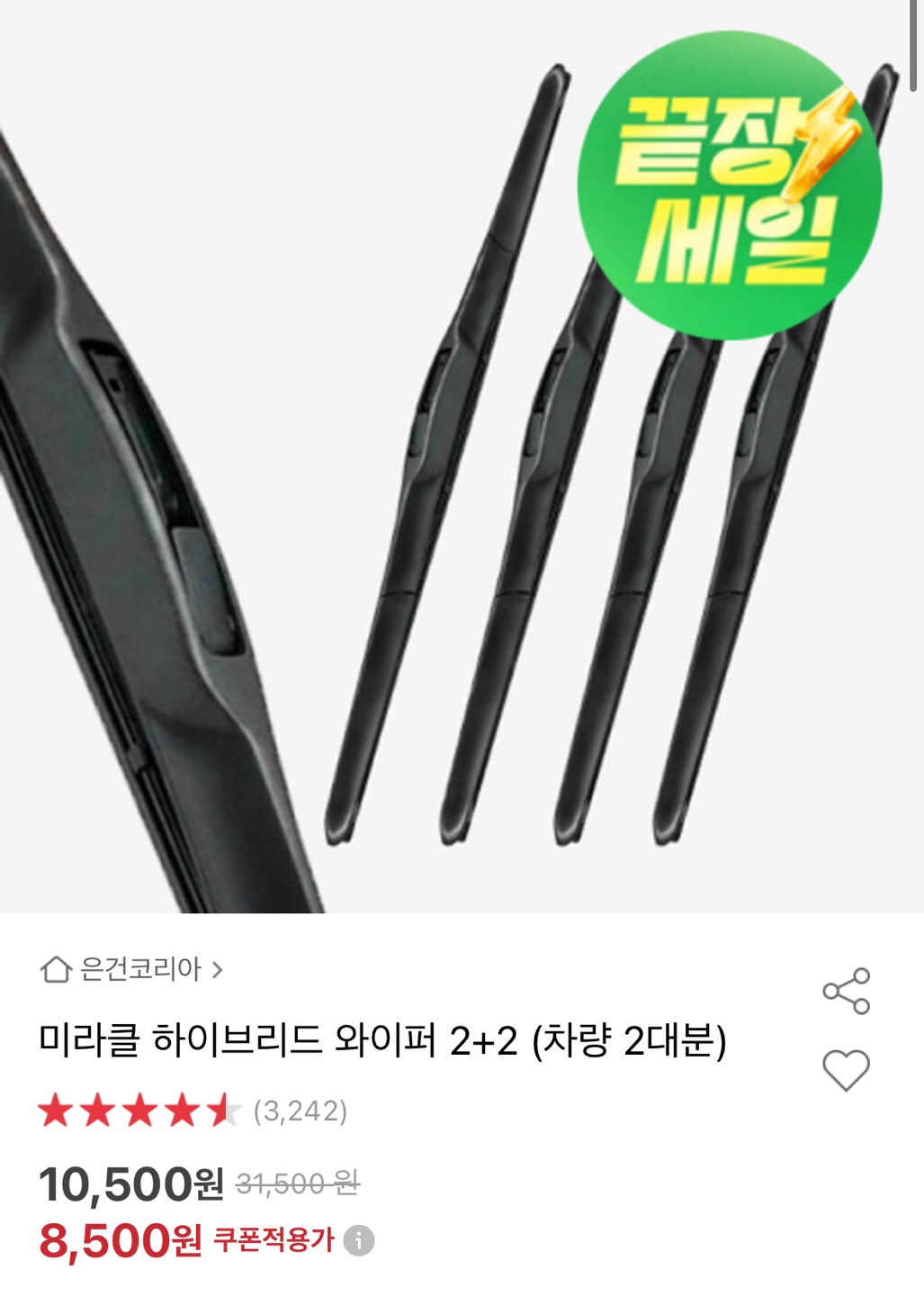 [옥션] 미라클 하이브리드 와이퍼 2+2 (8,500원/무료)