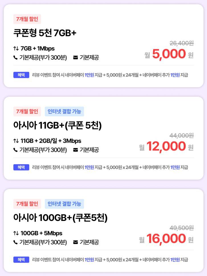 7GB+1Mbps : 쿠폰(네이버페이) 발급 시 0원 이용 가능
