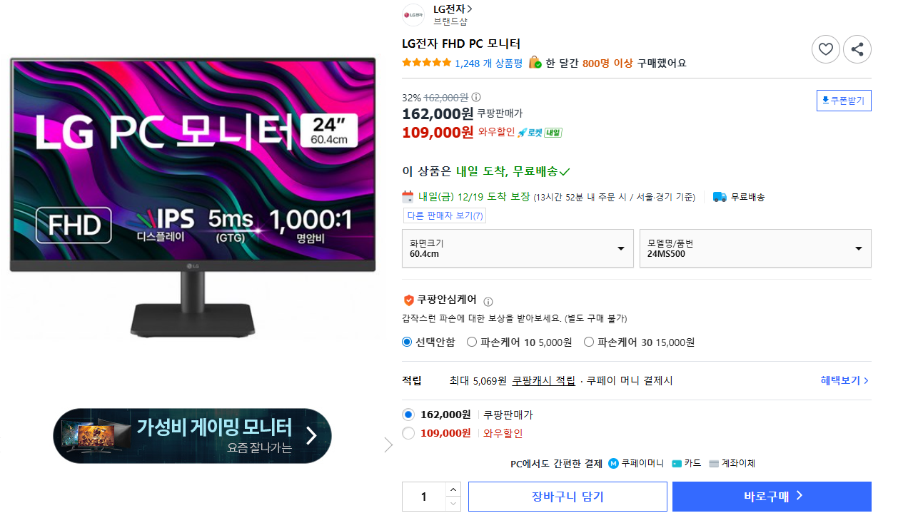 [쿠팡] 엘지 PC모니터 24MS500 (109,000원/무료)