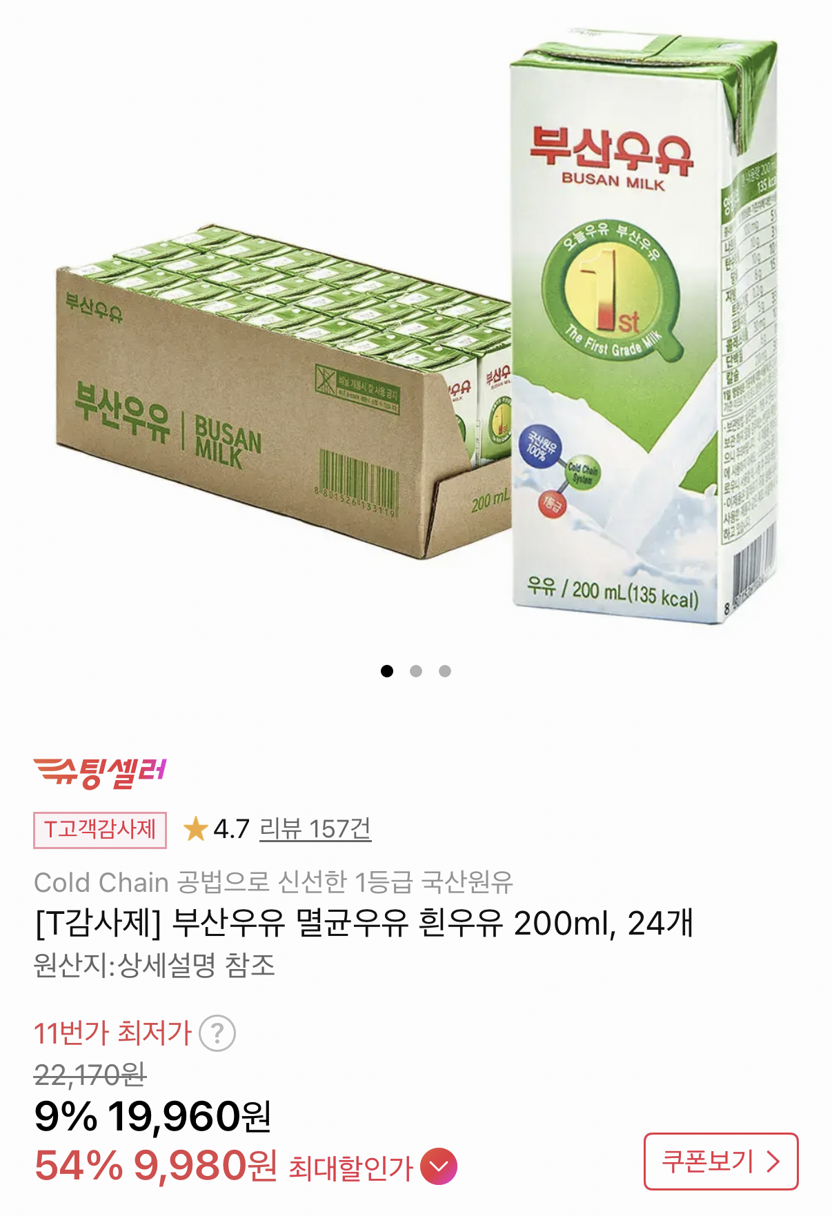 [11번가] 부산우유 멸균 흰우유 200ml 24팩 (9,980원/무료)