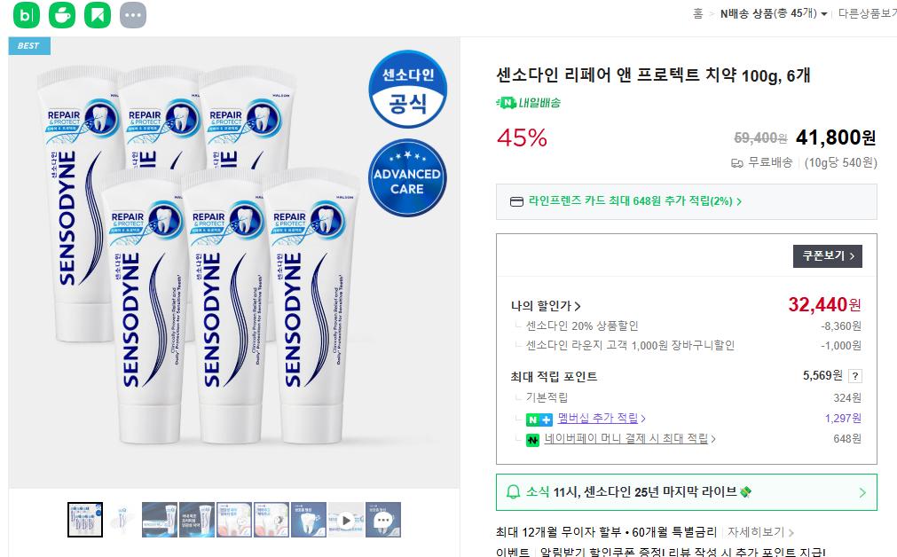 [네이버] 센소다인 리페어 앤 프로텍트 치약 100g, 6개 (32,440원 / 무배) > 국내핫딜