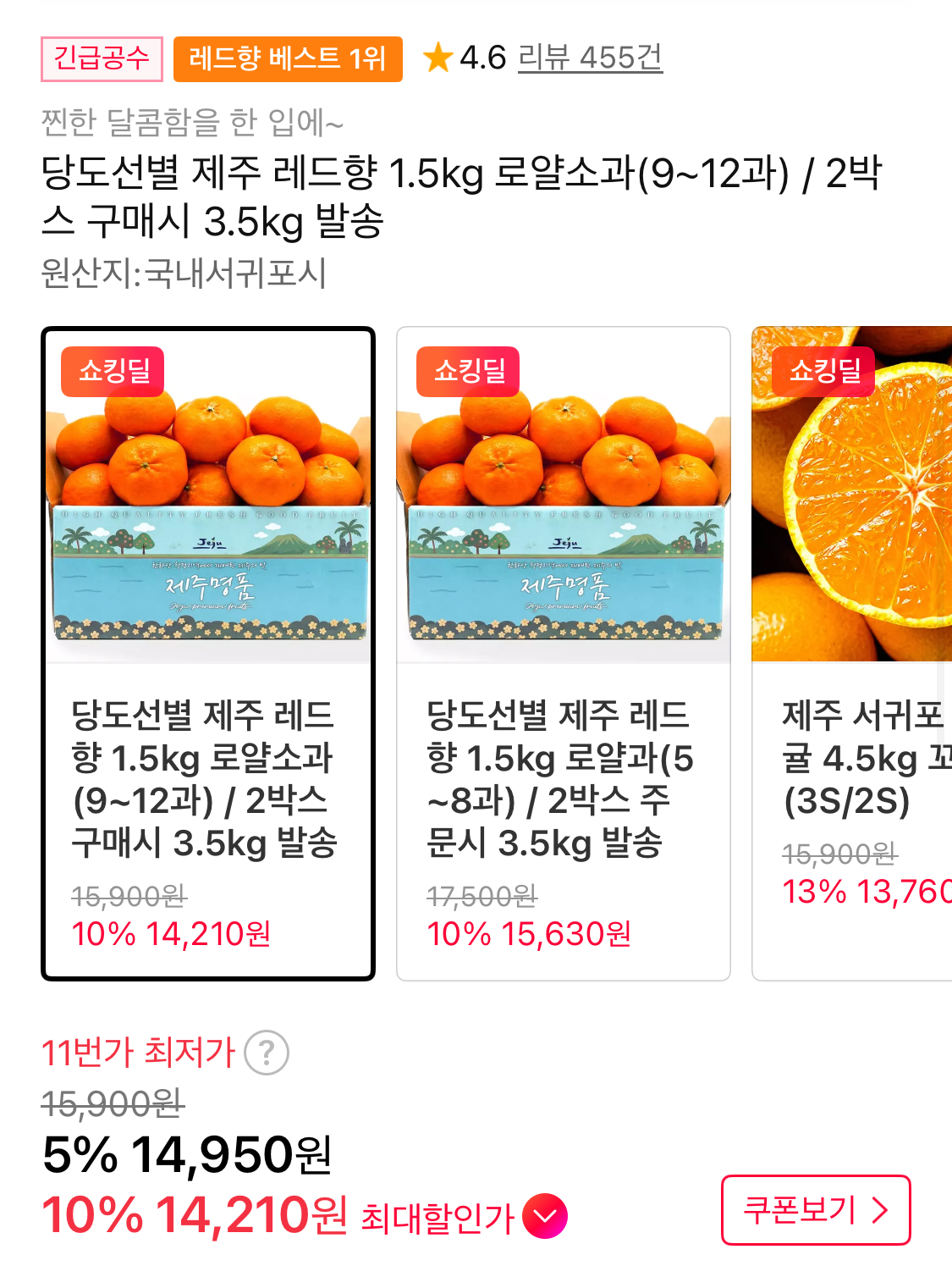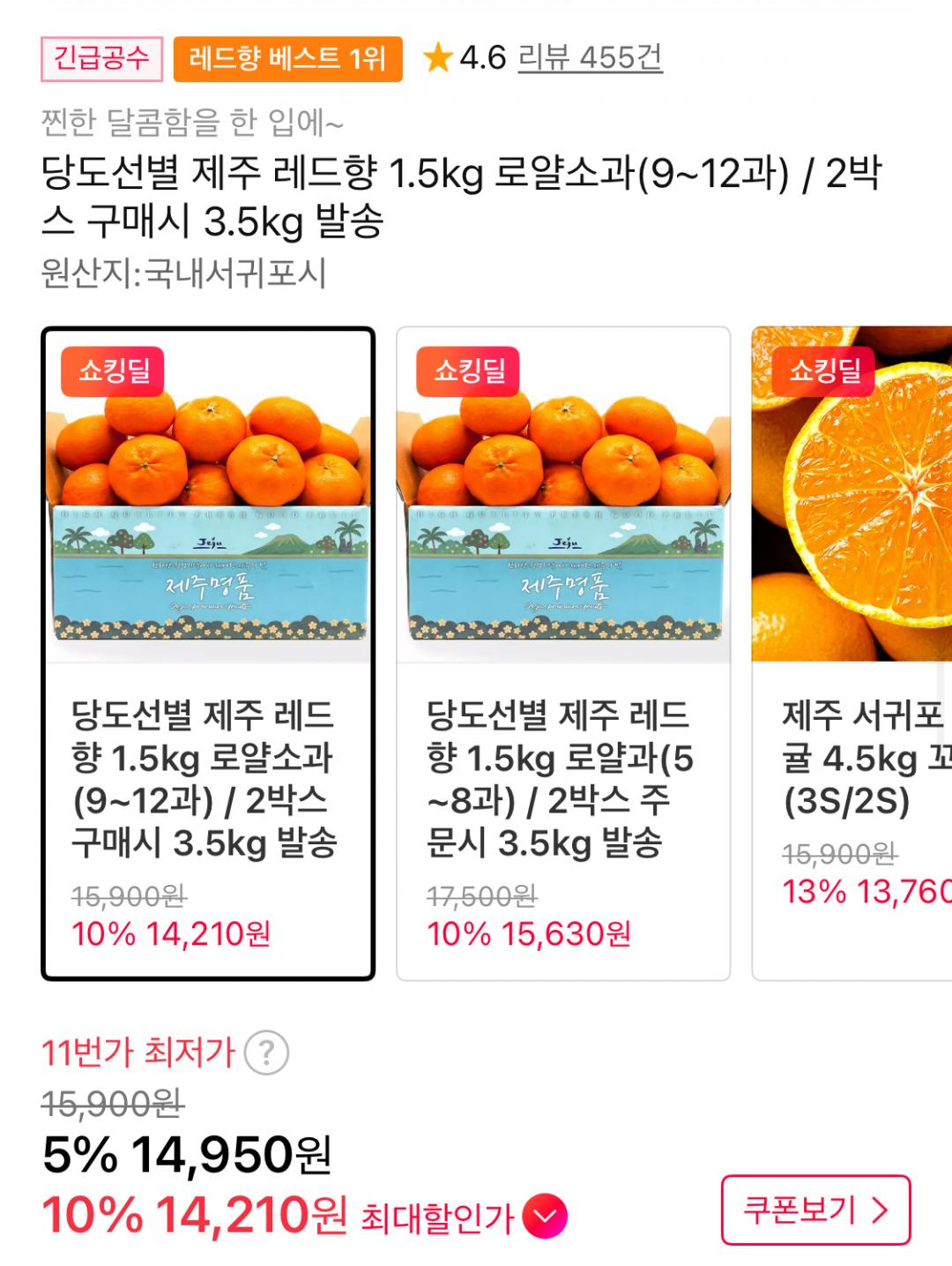 [11번가] 당도선별 제주 레드향 1.5kg 로얄소과(9~12과) (14,210원/무배) > 국내핫딜