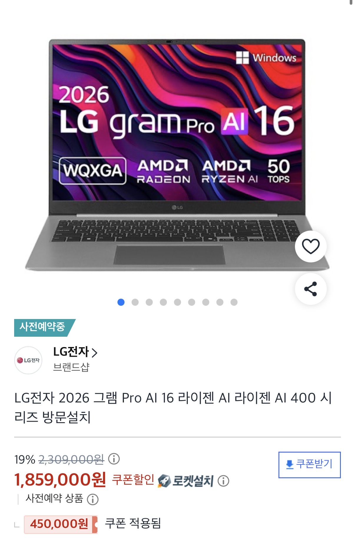 [쿠팡] 엘지 그램 Pro 16Z95U-GS5BK (1,859,000원/무료)