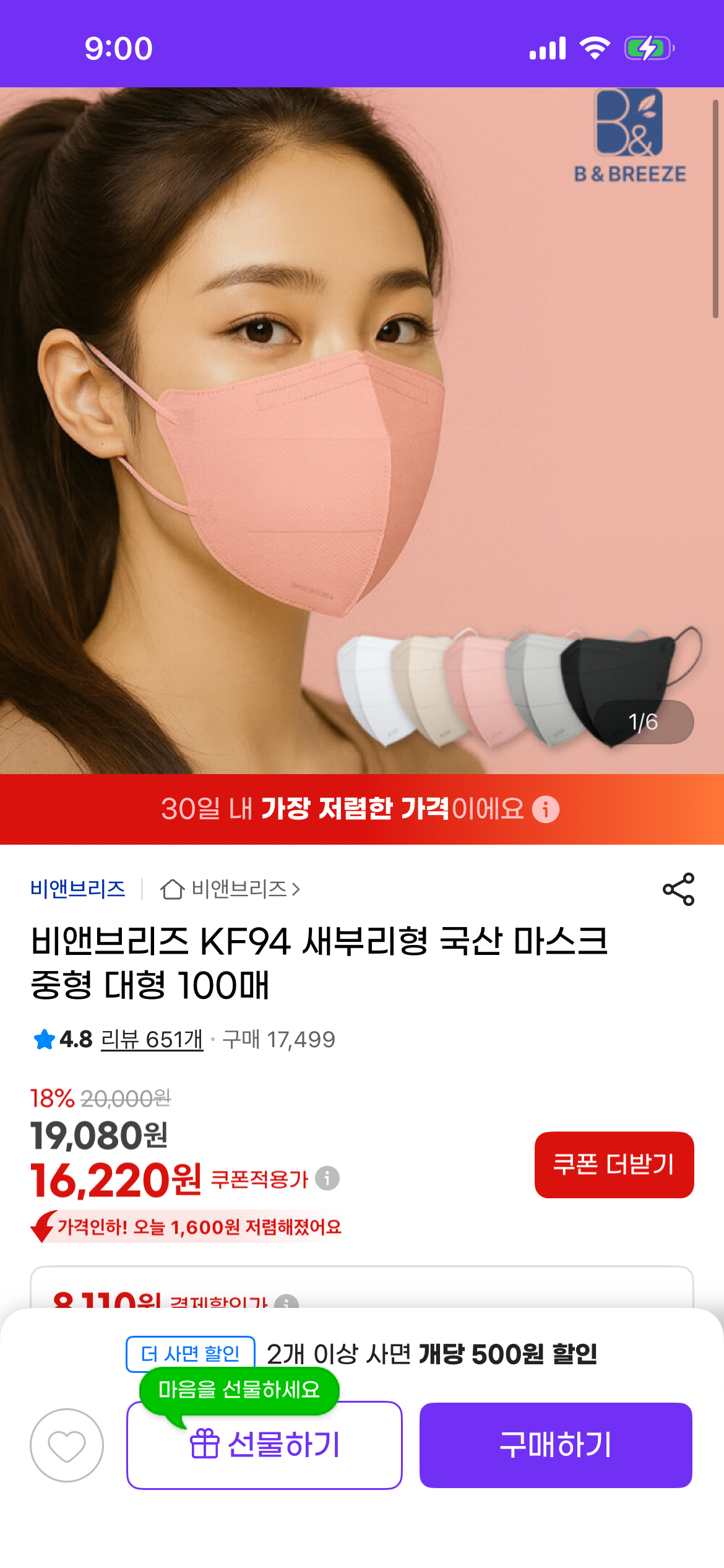 [지마켓] 비앤브리즈 KF94 새부리형 국산 마스크 중형/대형 100매 (16,200원/무료 ) > 국내핫딜