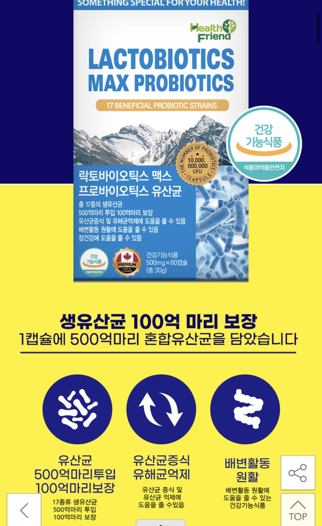 유산균은 보장균수 높은게 좋아서 한캡슐에 500억마리 투입, 100억마리 보장이라 마리수도 높은 유산균입니다