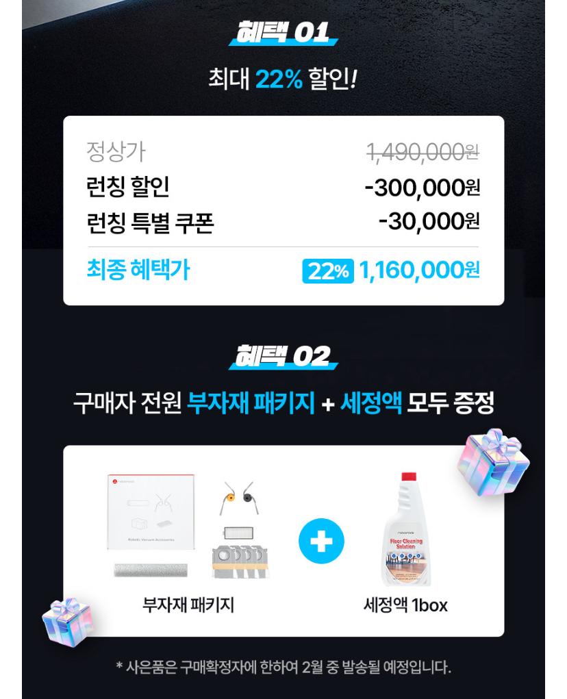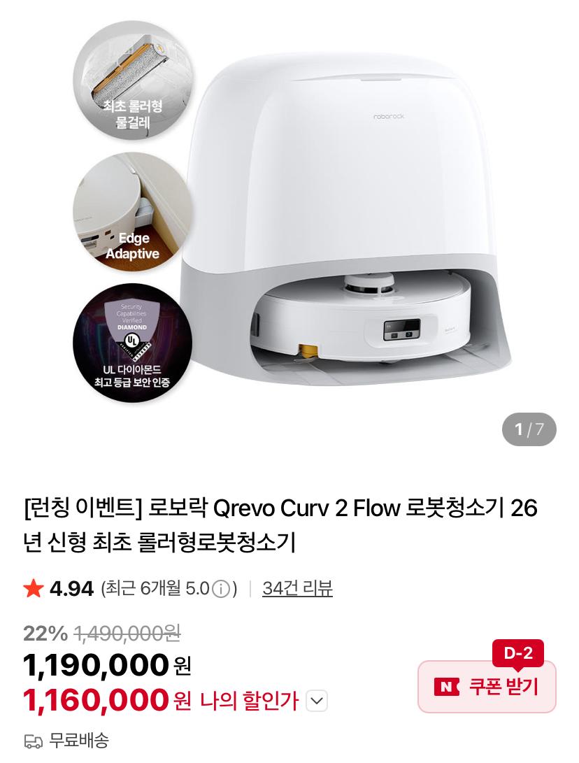 롤러형 로봇청소기 중 현재 최저가 라인 신제품인데 런칭 쿠폰 적용가 116만원이라 가격 메리트 있네요.