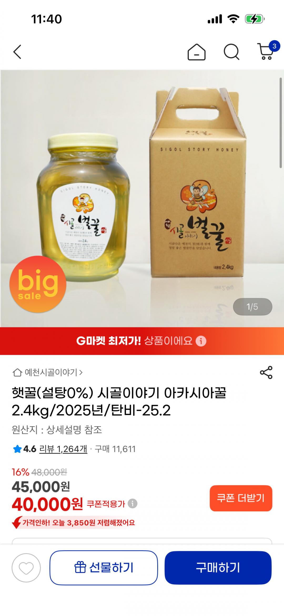 [지마켓] 시골이야기 아카시아꿀 2.4kg (40,000원/무료)