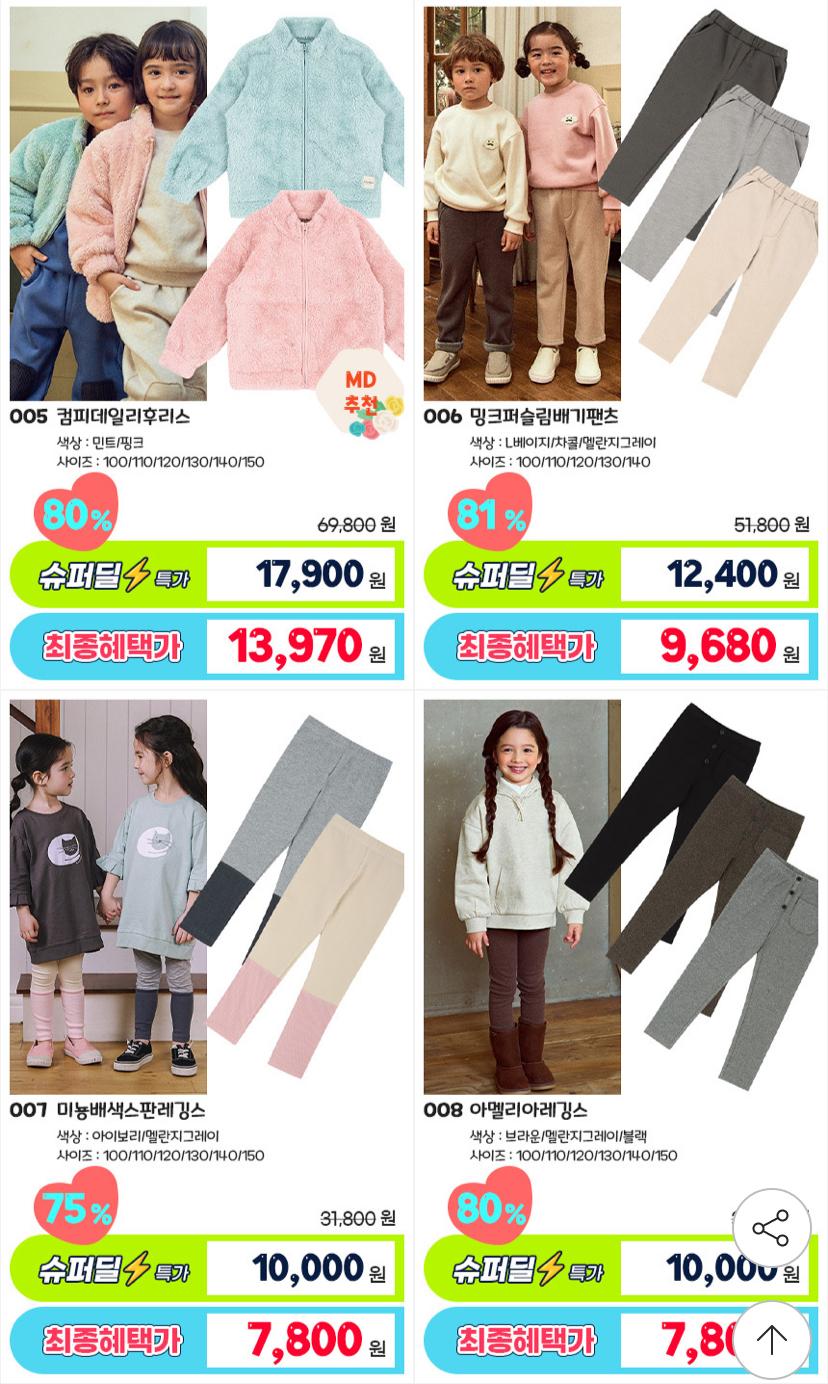 점퍼나 티셔츠 팬츠 상하복 원피스 기모레깅스 등 다양합니다