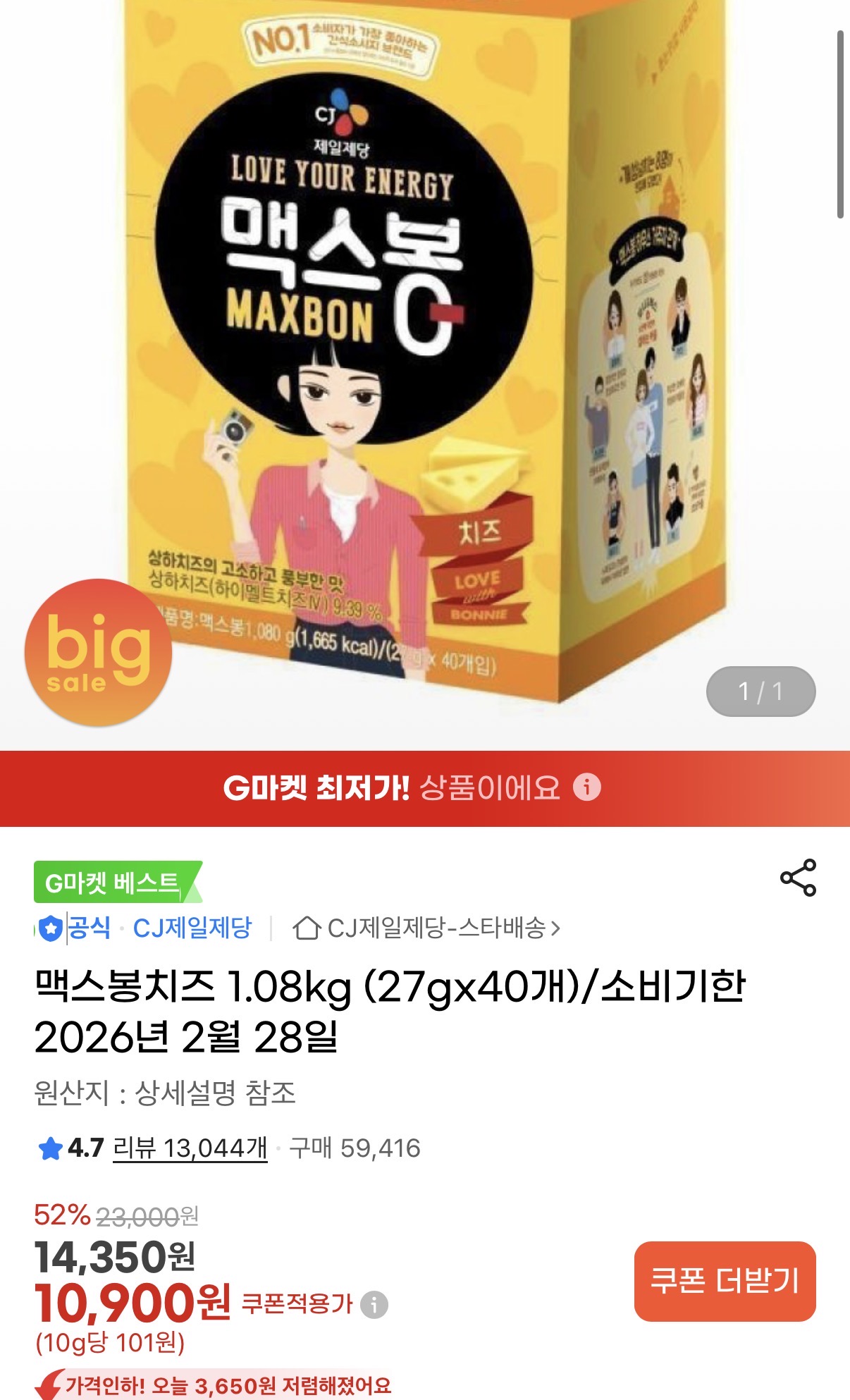 [지마켓] 맥스봉치즈 1.08kg (27gx40개) (10,900원/무료)