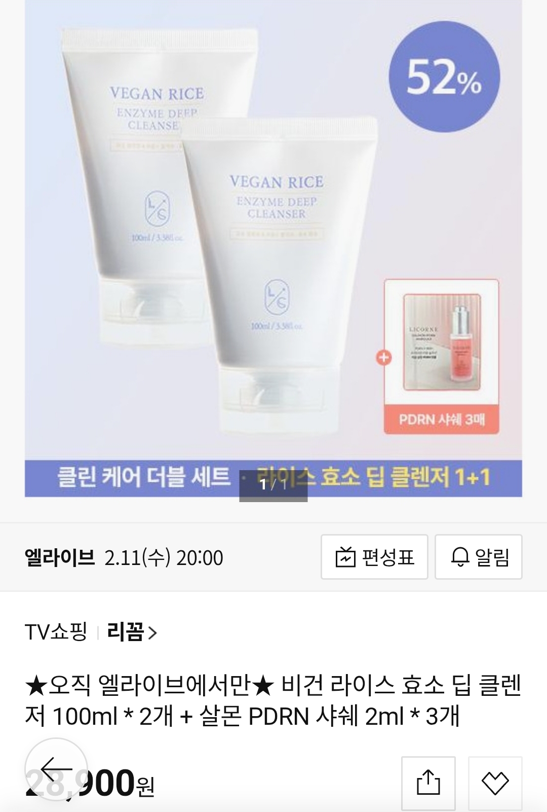 [롯데홈쇼핑]비건 라이스 딥 클렌저 100mlx2개+살몬 PDRN 샤쉐 2mlx3개(28,900원/무배) > 국내핫딜