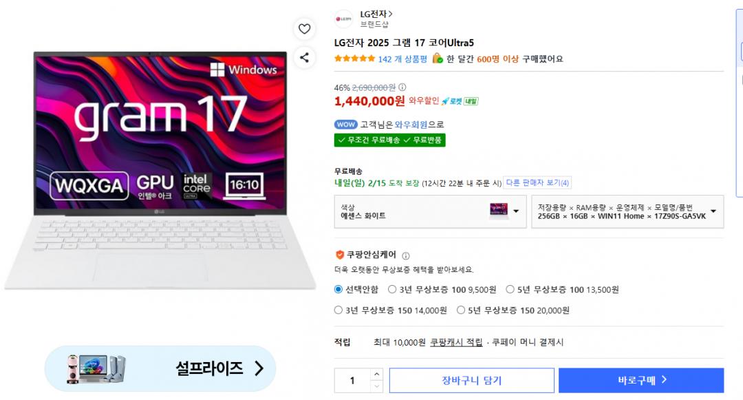 [쿠팡] 엘지 그램 17Z90S-GA5VK (1,440,000원/무료)