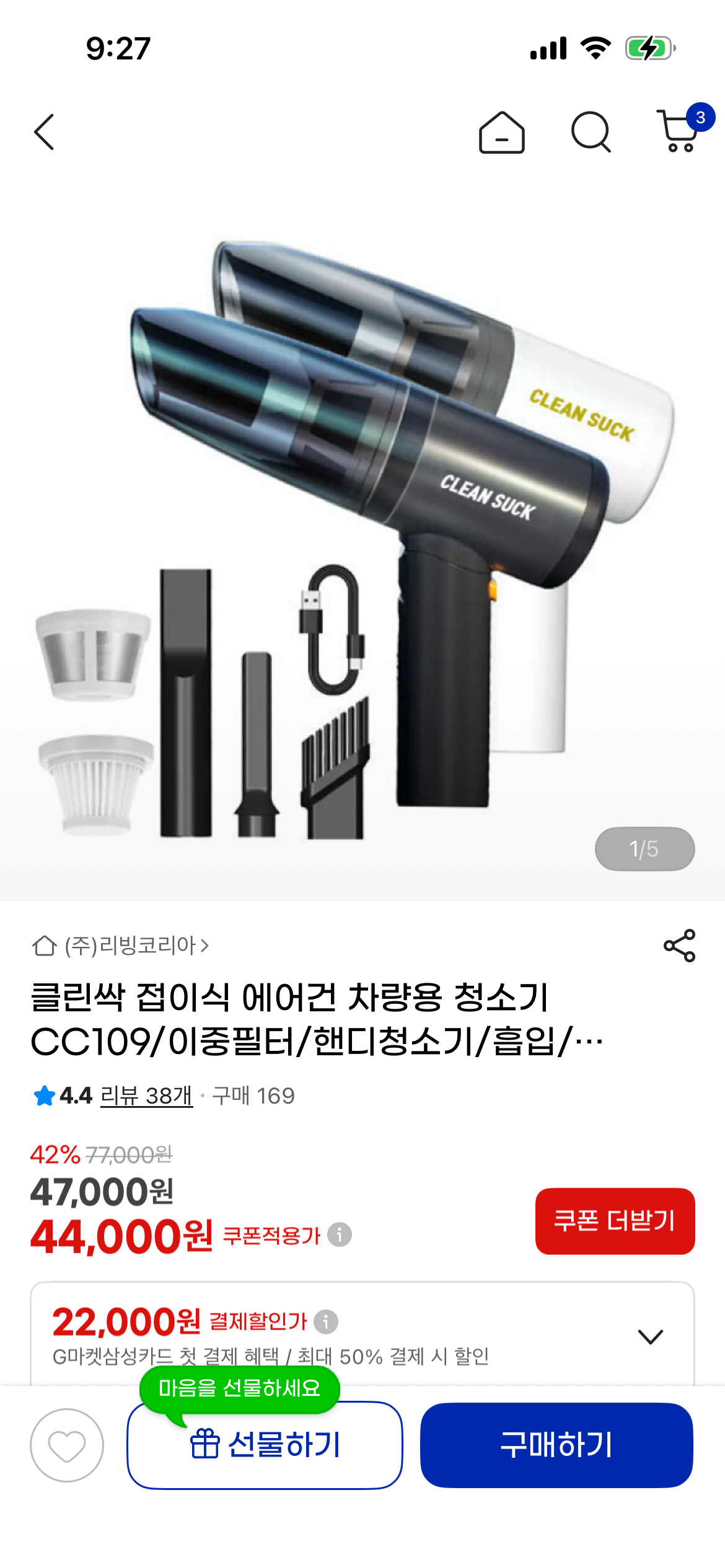 [지마켓] 접이식 에어건 차량용 청소기 (44,000원/무료)