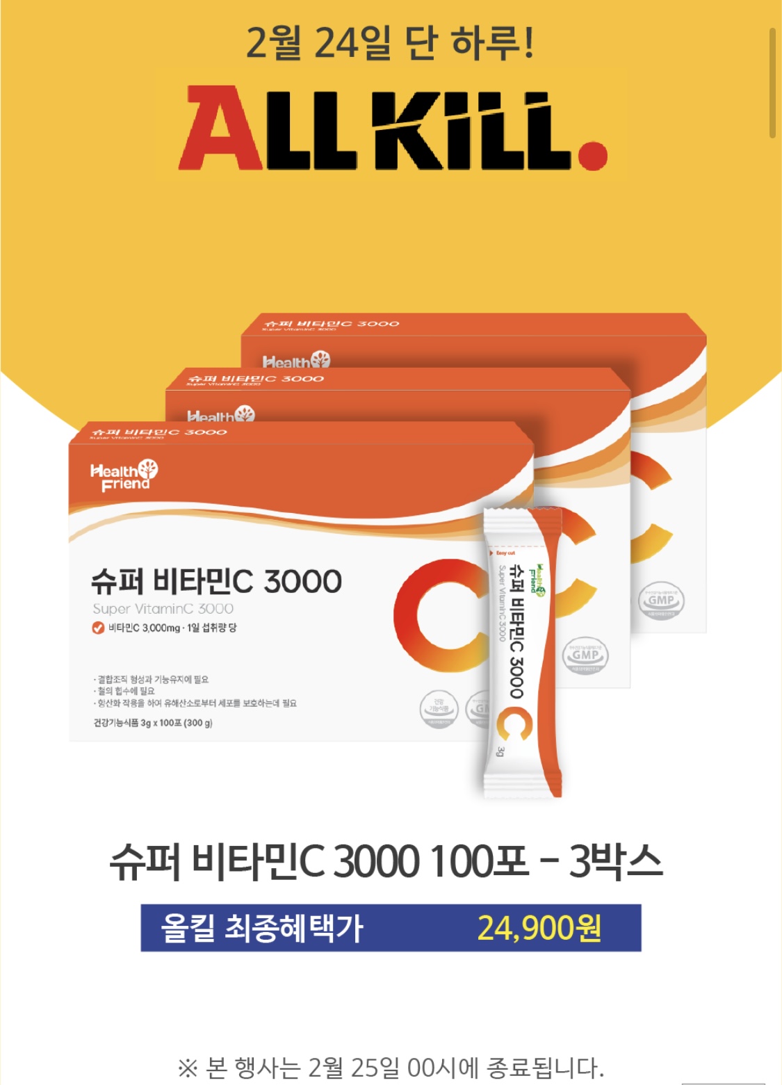 [옥션] 고함량 슈퍼 비타민C 3000 3박스(300포) 대용량 10개월 (24,900원/무료) > 국내핫딜