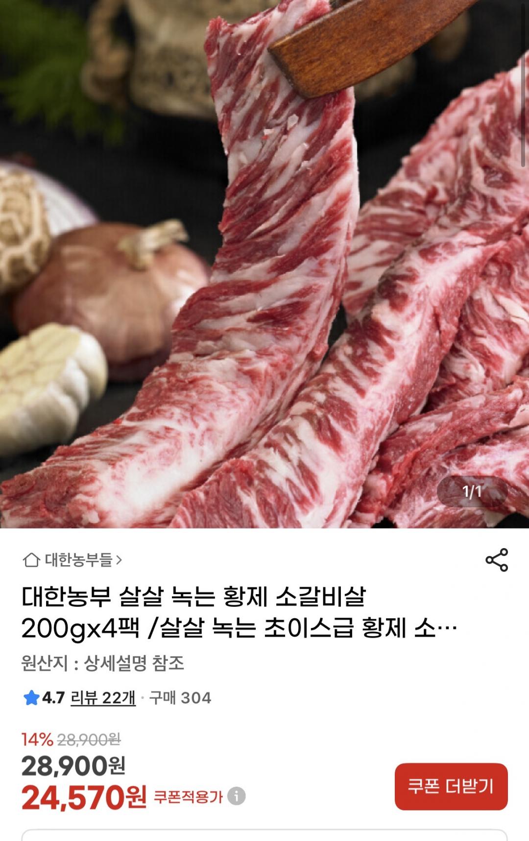 [지마켓] 대한농부 살살 녹는 황제 소갈비살 200g 4팩 (24,570원/무배) > 국내핫딜