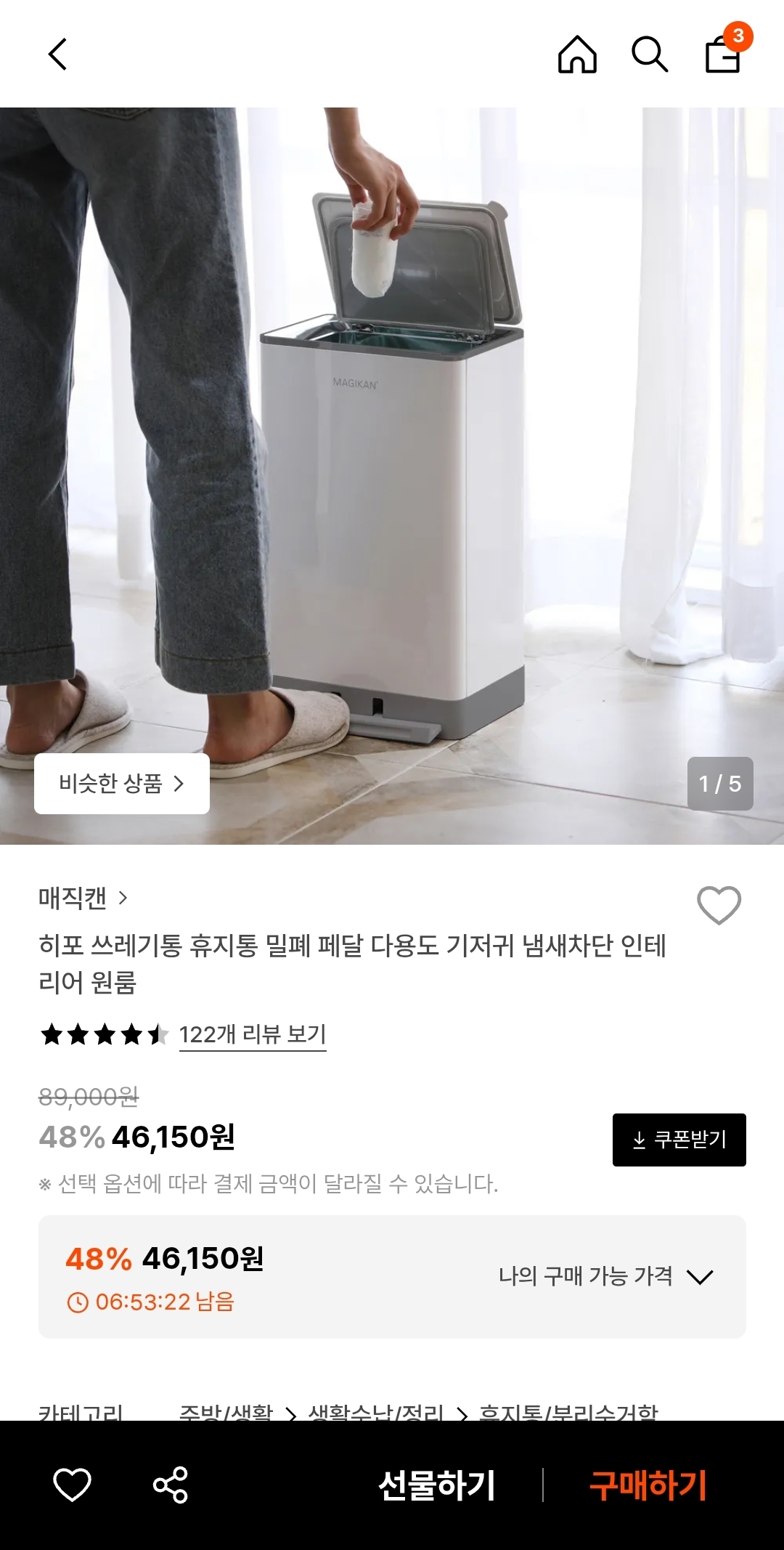 [29CM] 매직캔 히포 냄새차단 밀폐 휴지통 (46,150원/무배) > 국내핫딜