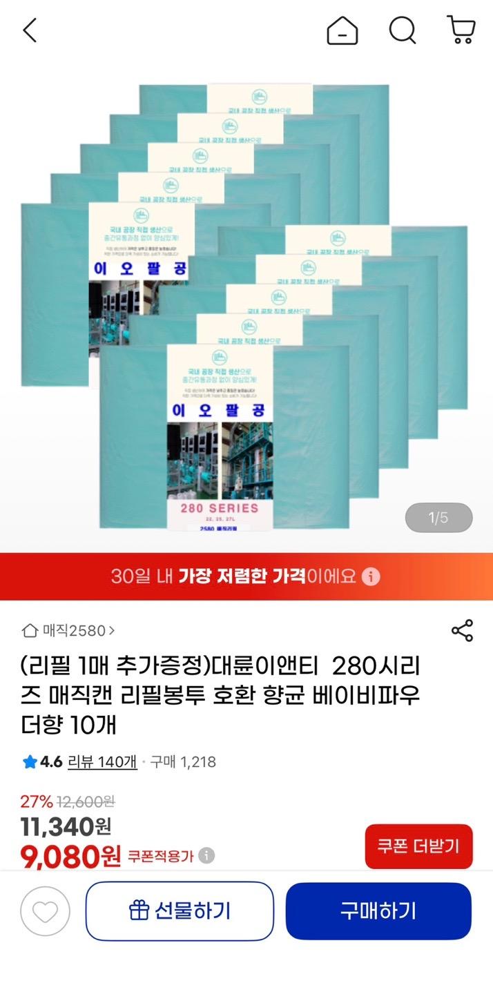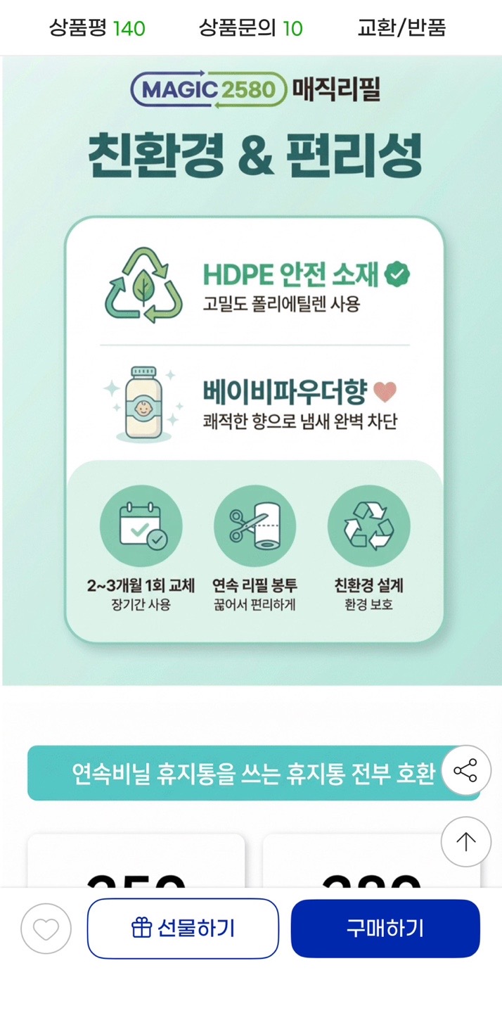 [지마켓] 대륜이앤티 매직캔 리필봉투 호환 280시리즈 베이비파우더향 10개 + 리필1매 증정 (9,080원/무배) > 국내핫딜