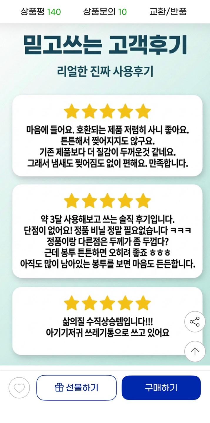 비닐 퀄리티 좋아서 냄새 차단 잘 되고 잘 안 찢겨요