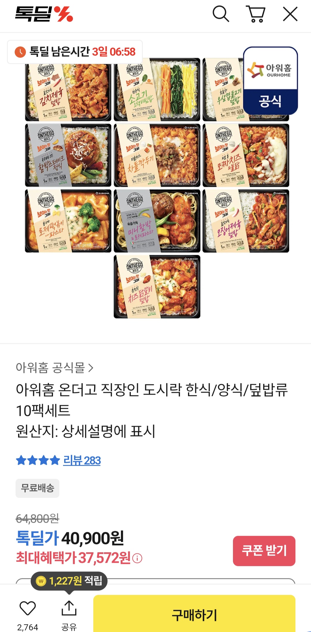 [톡딜]아워홈 온더고 직장인 간편 도시락 10팩 세트 (37,572원/무료) > 국내핫딜