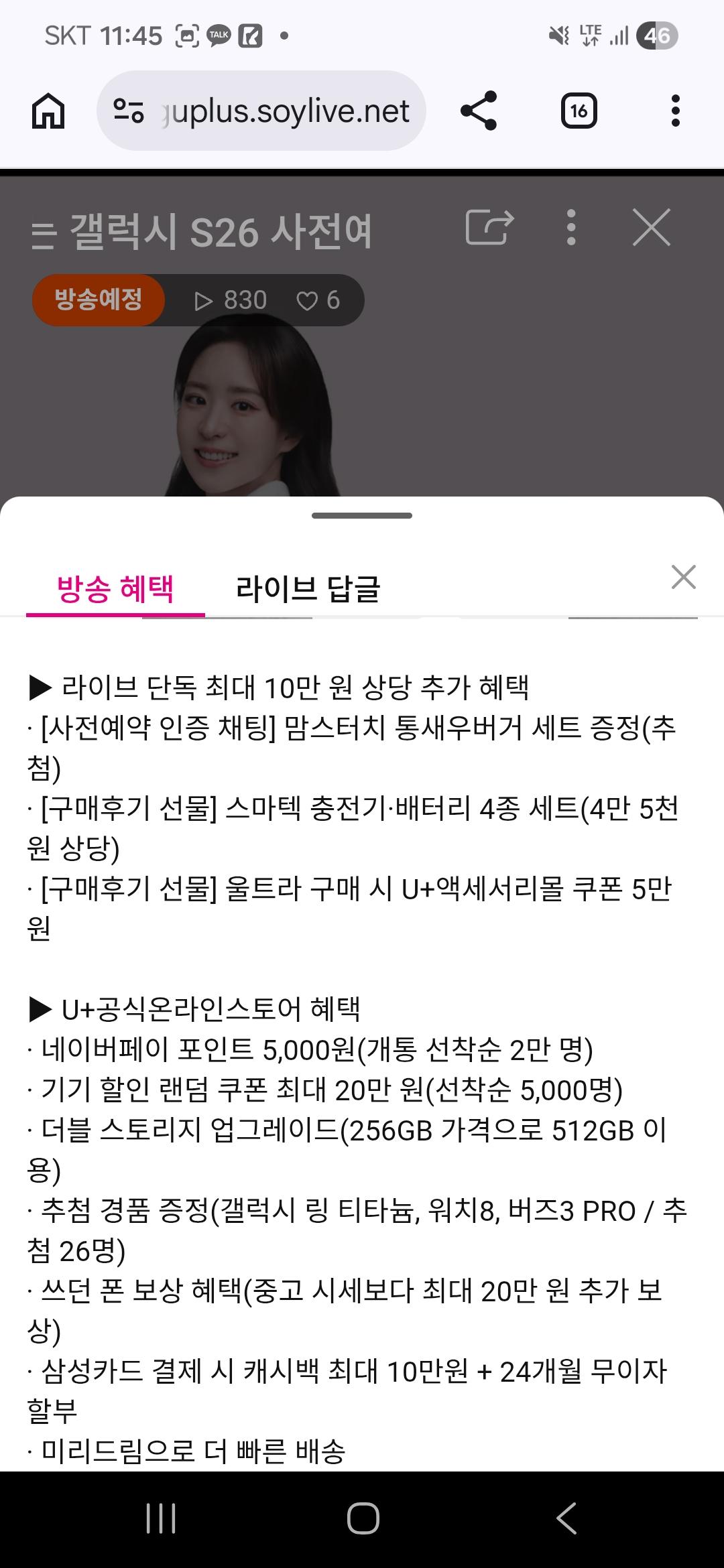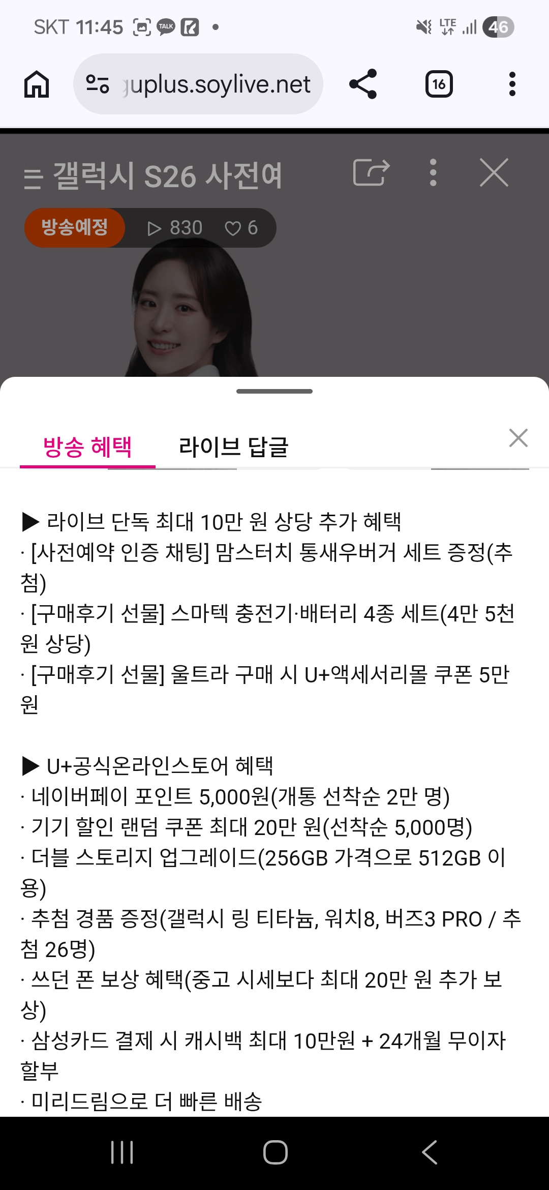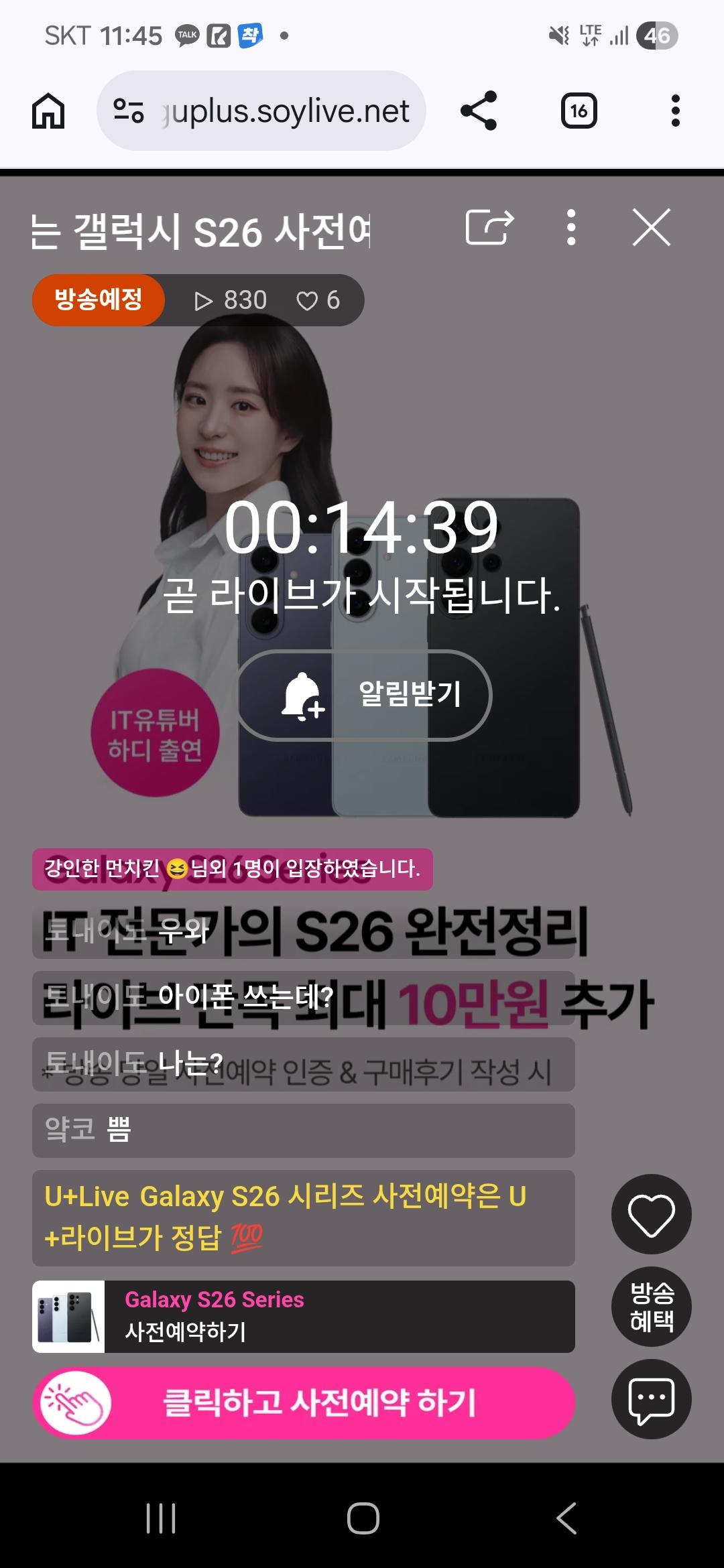 라이브 혜택도 10만원 정도 더 있다고 하니 S26 사전예약 생각 있으면 방송 봐보세요~