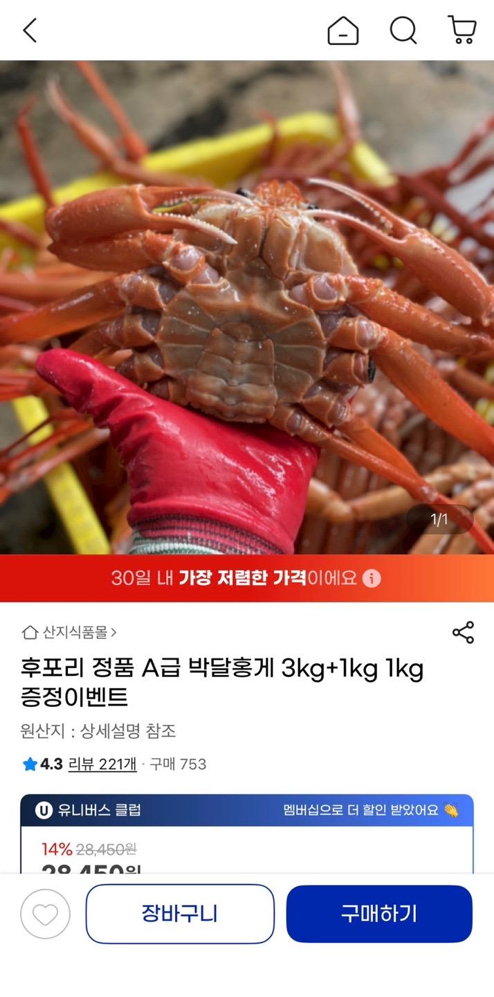 [지마켓] 후포리 A급 박달홍게 3kg+1kg (26,450원/무배) > 국내핫딜