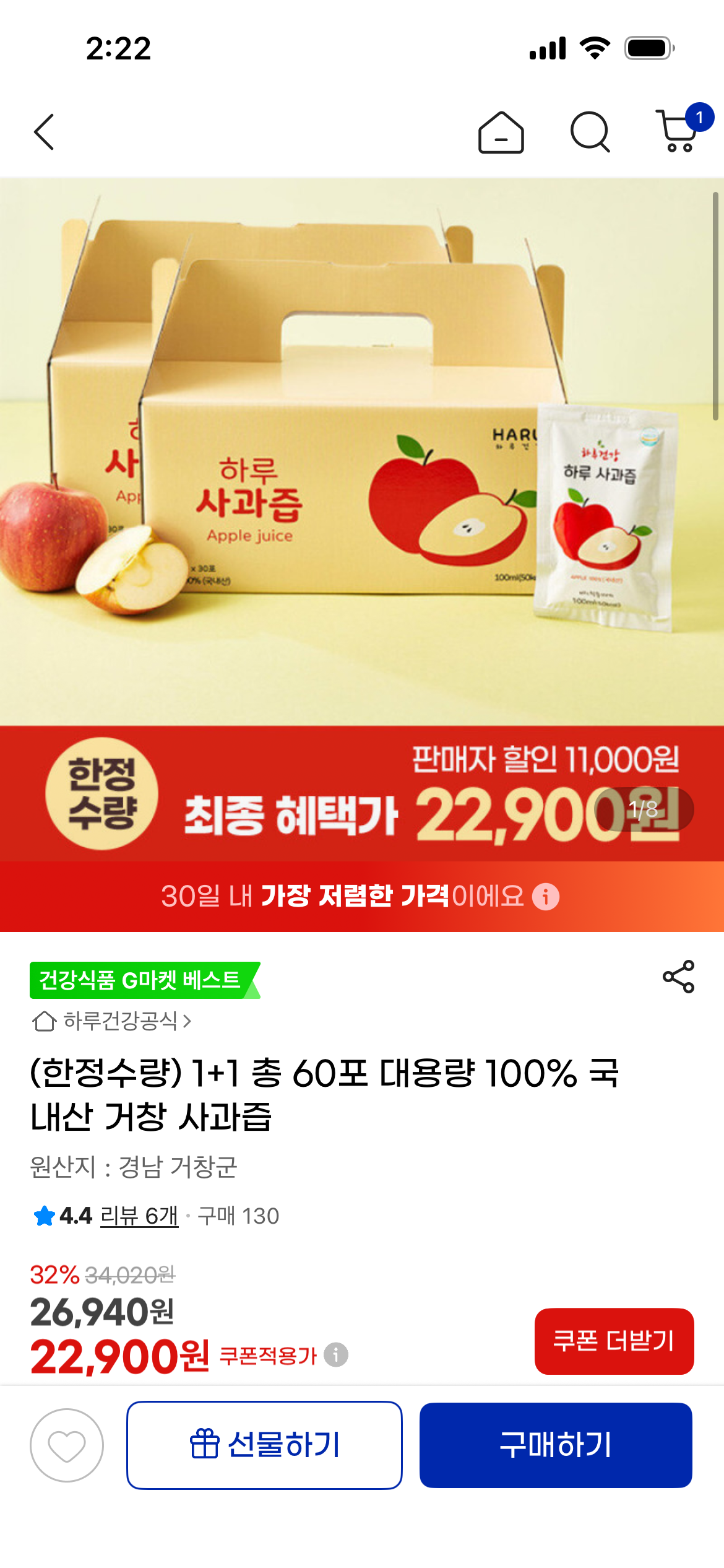[지마켓] 100% 국내산 거창 사과즙 60포 대용량 (22,900원/무료)