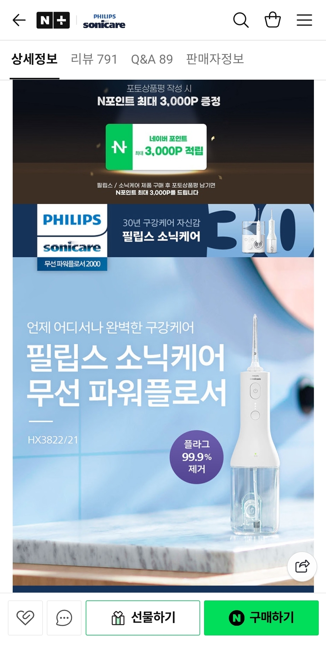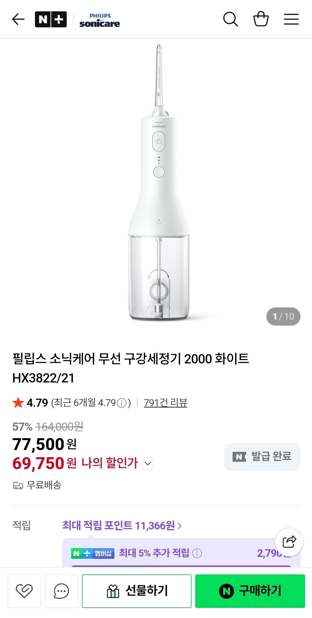 [네이버]필립스 소닉케어 무선 구강세정기 2000 화이트 HX3822/21 69,750원 / 무배 > 국내핫딜