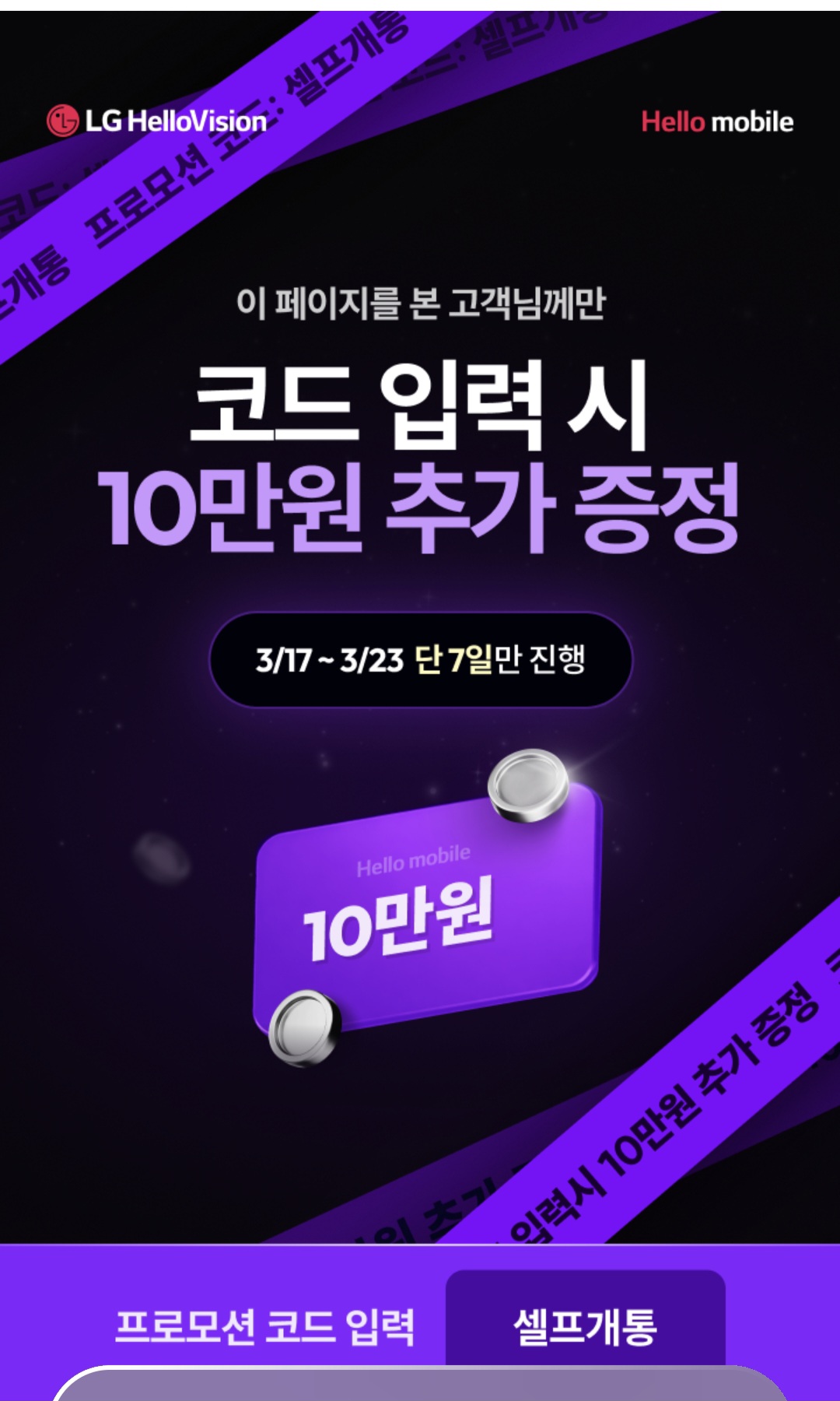 [셀프개통]코드입력 10만원(3/23일까지 개통시)