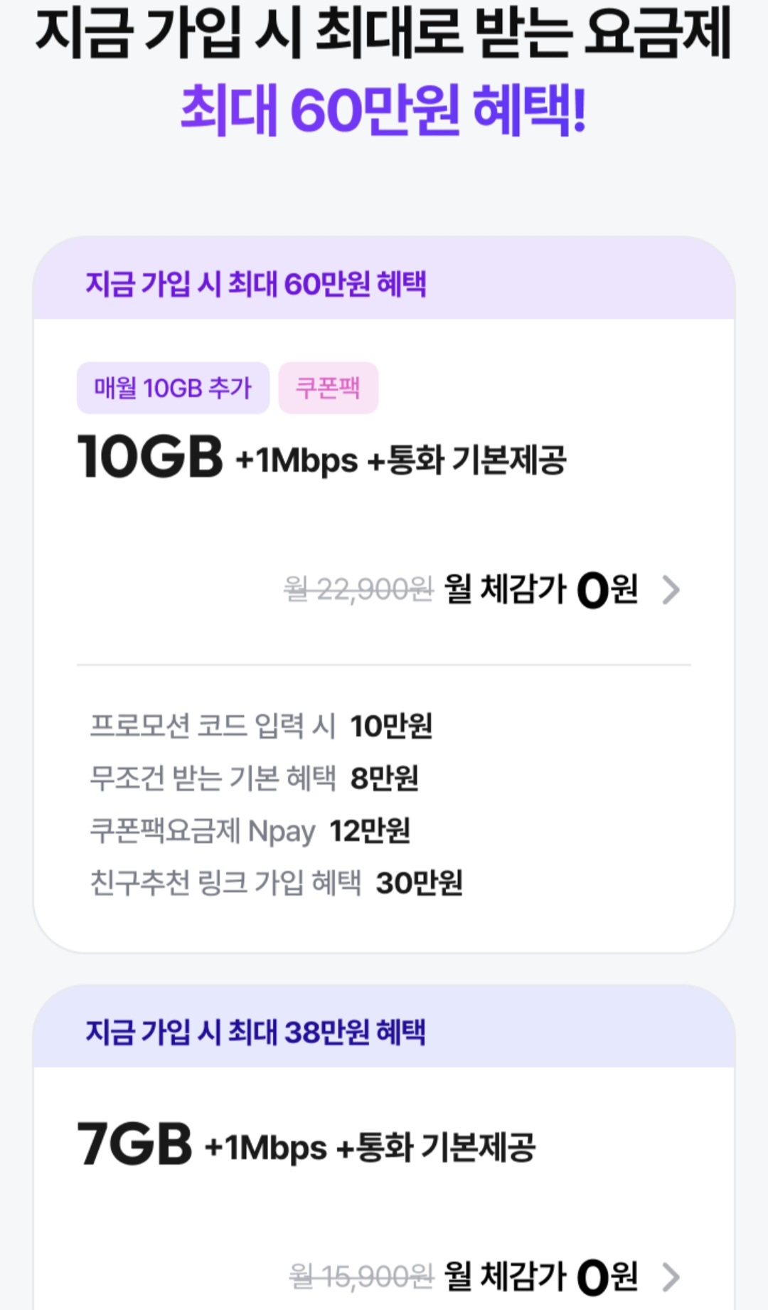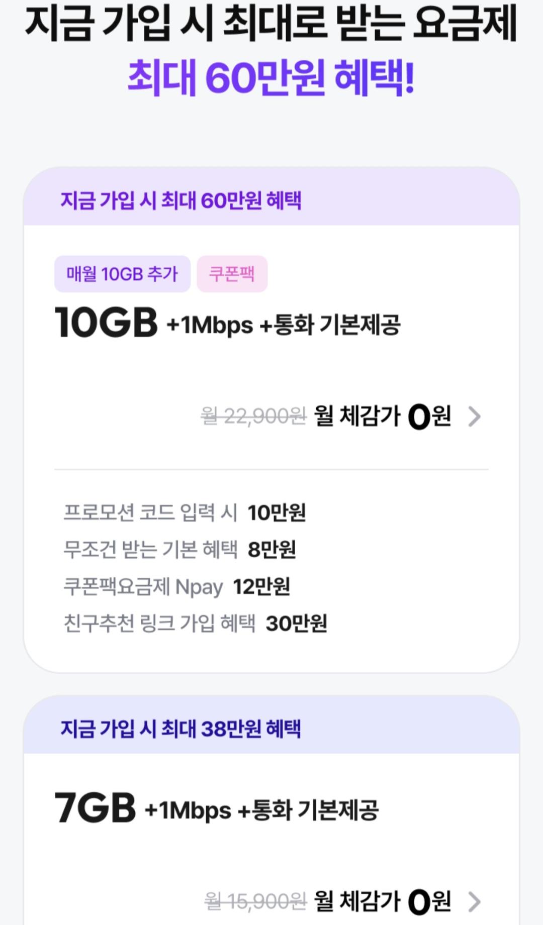 [헬로모바일] 요금제 10GB+1mbps (월22,900원/무료)