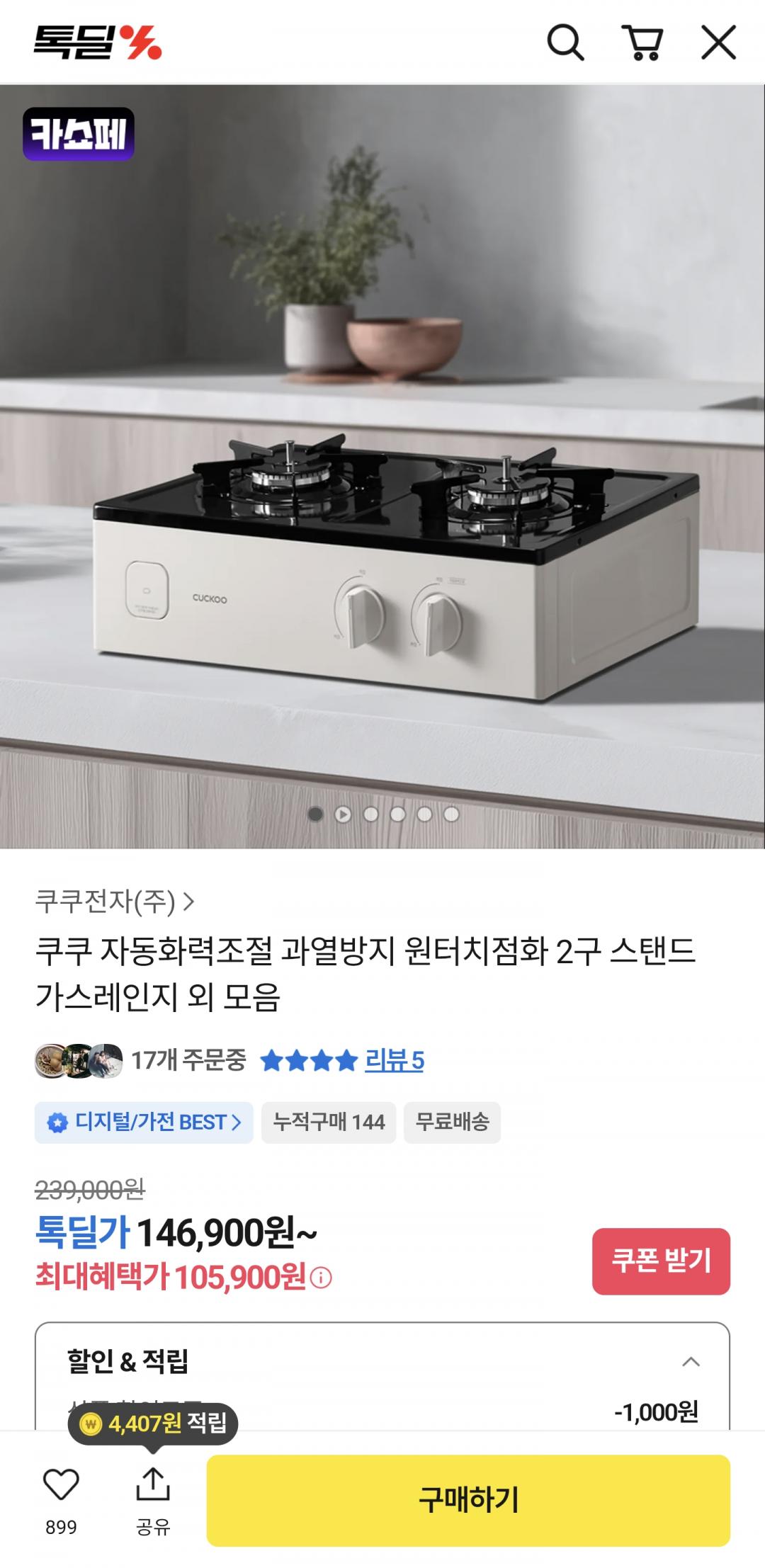 [카카오] 쿠쿠 2구 자동화력 가스레인지 (105,900원/무배) > 국내핫딜