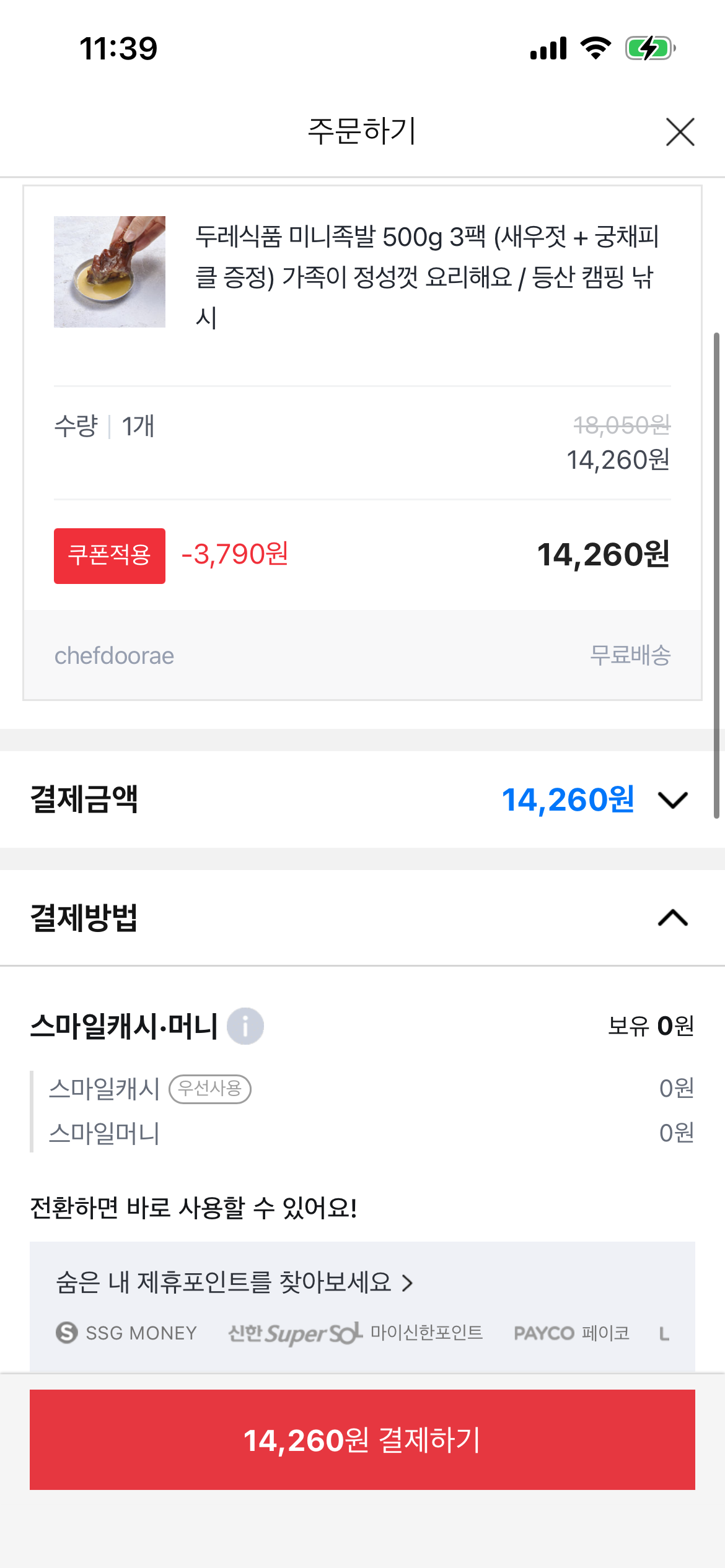 [옥션] 두레식품 미니족발 500g 3팩 새우젓 + 궁채피클 증정 (14,260/무료)