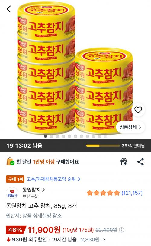 [쿠팡] 동원참치 고추참치 85g 8개 (11900원/무배) > 국내핫딜