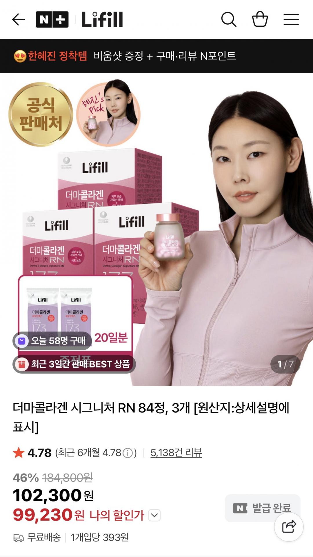 네이버] 더마콜라겐 시그니처 RN 84정 3개 (99,230원/무료)